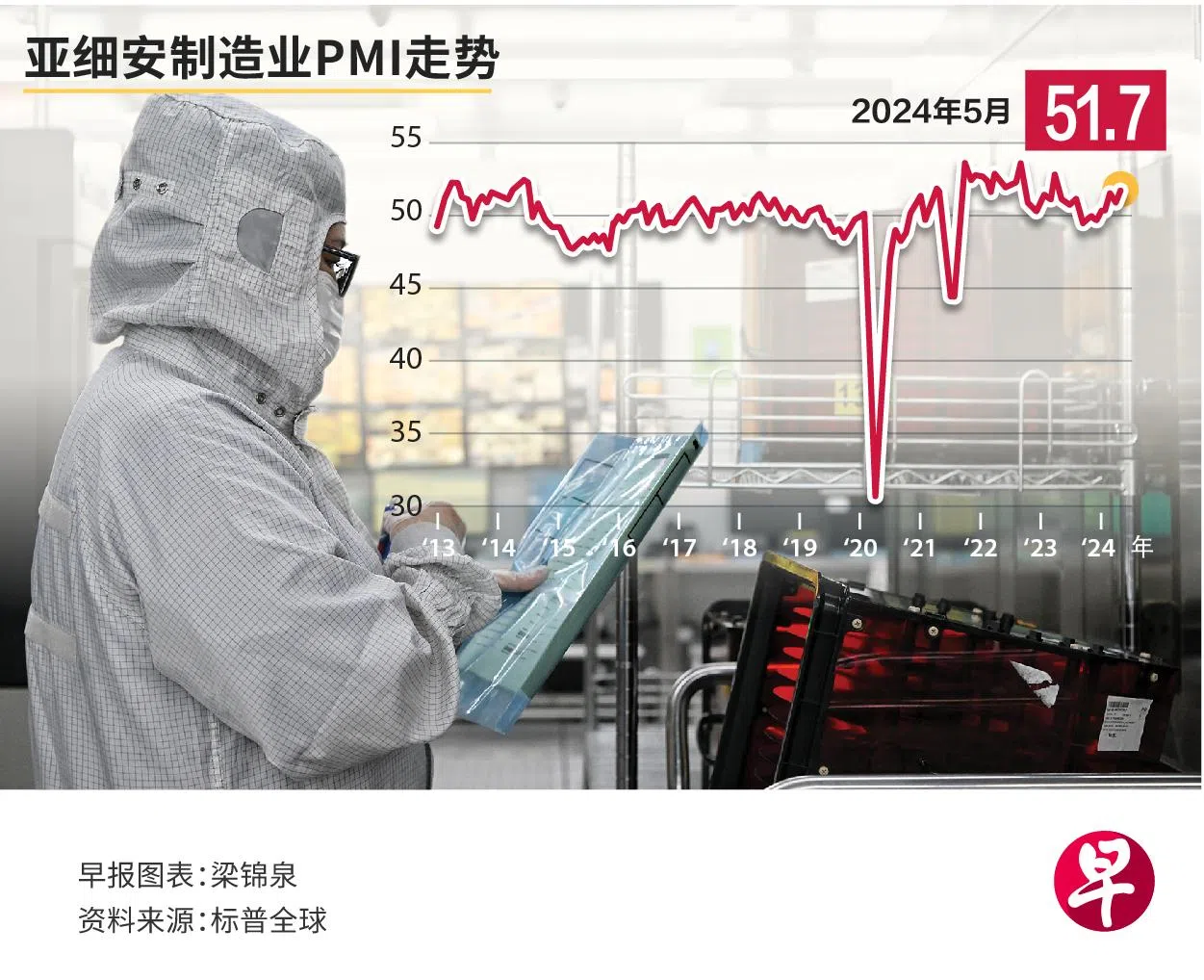 根据标普全球(S&P Global)星期二(6月4日)发布的最新报告,亚细安制造业采购经理指数(PMI)从4月的51.0,升至5月的51.7,为去年4月以来最高。