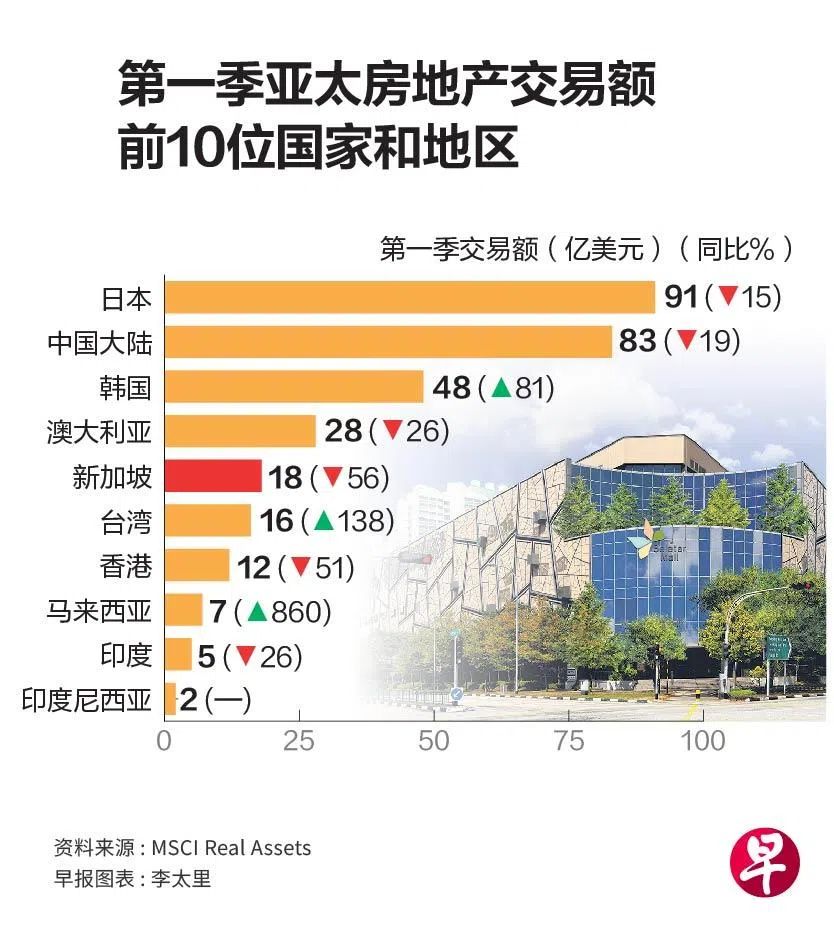 MSCI旗下MSCI Real Assets最新发布的《亚太资本趋势报告》显示,受高利率影响,新加坡首季房地产交易额同比下滑56%至18亿美元(约24亿新元)。过去12个月的交易额则同比减少47%至64亿美元,也是区域第五。