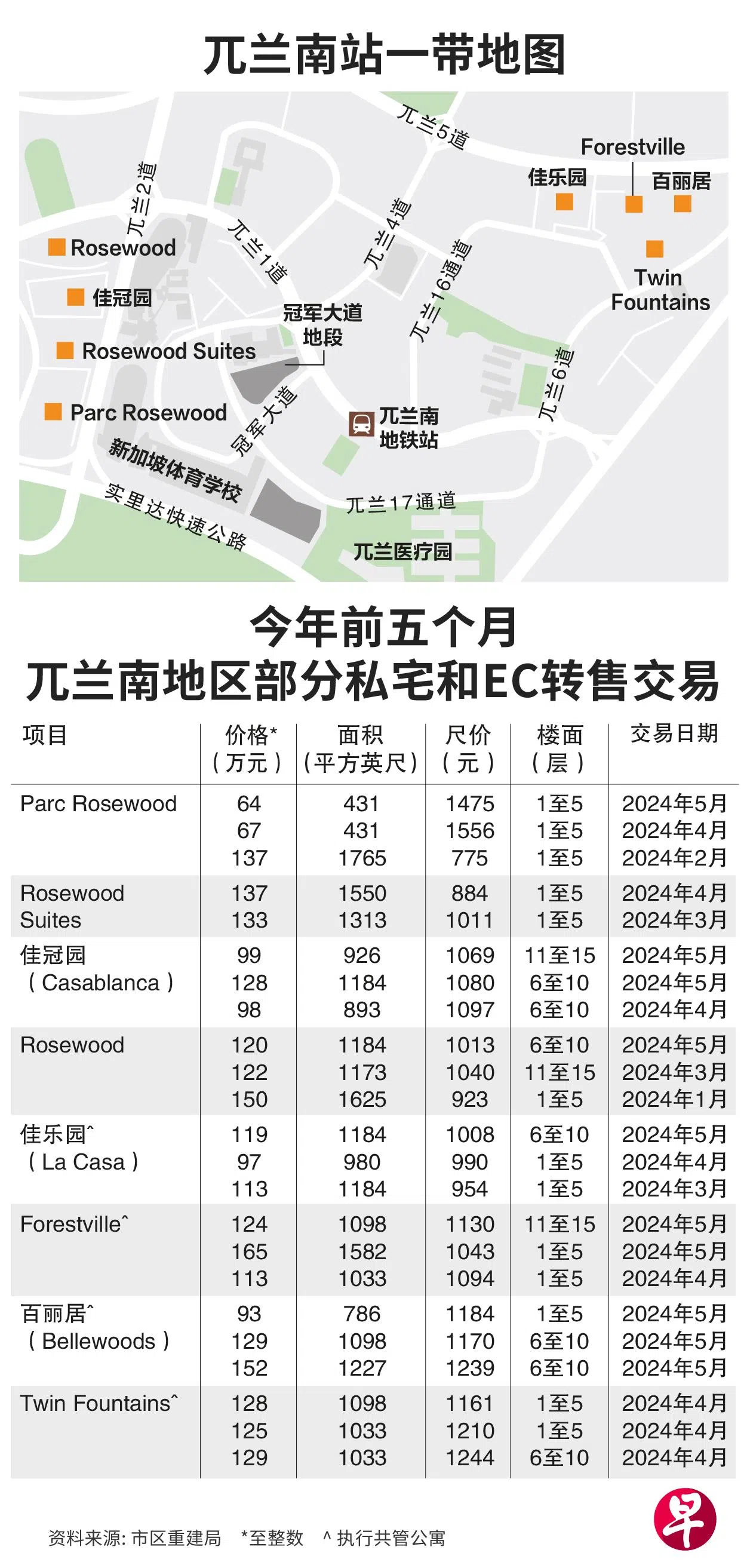 该地区12年前推出的私宅地段,现已发展成99年地契的Parc Rosewood。这个拥有689个单位的项目,当时由飞龙集团(Fragrance Group)和世界级置地公司(World Class Land)合资的Kensington Land打造。虽然Parc Rosewood离地铁站有一段距离,但它在2012年初开盘后四个小时内,就卖了120个单位。今年前五个月,私宅有10个单位转手,尺价介于775元至1556元,其中多为一卧房单位。唯一的三卧房单位在2月以137万元成交。