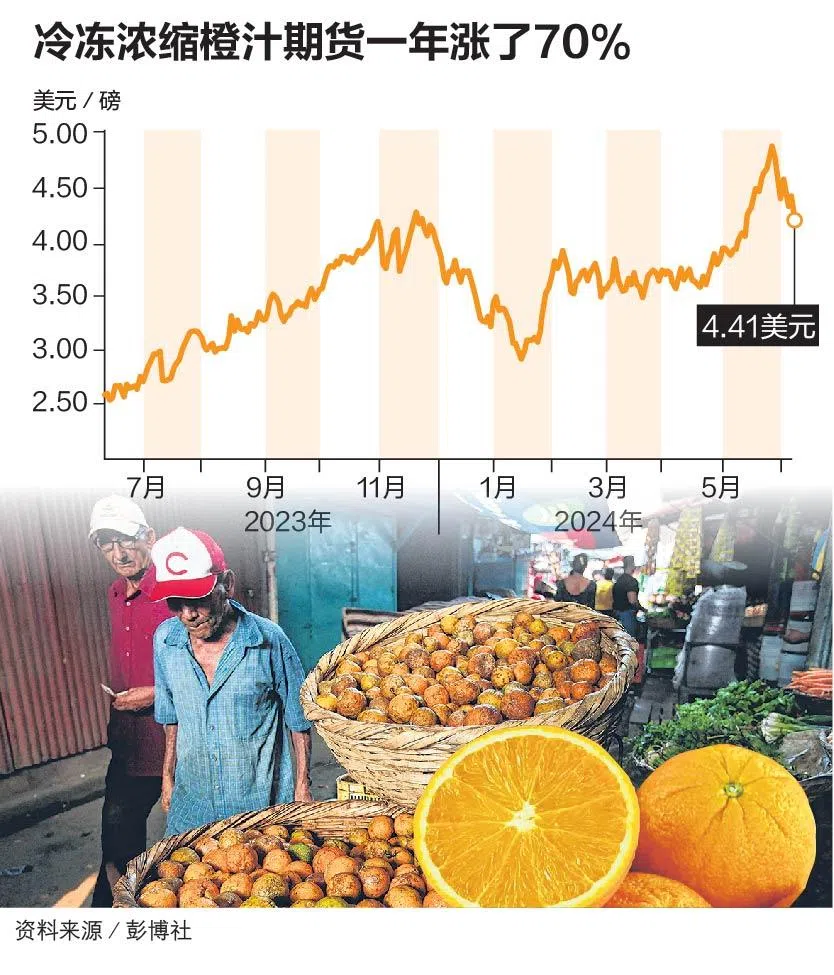 自2022年底以来,橙汁期货价格一路飙升,今年5月更是急速攀升,于月底达到每磅4.95美元(约6.7新元)的历史新高。一年前,橙汁期货价格约为每磅2.6美元,几乎翻了一番。