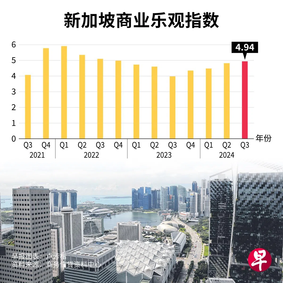 新加坡商务信贷资料中心(Singapore Commercial Credit Bureau,简称SCCB)星期一(6月10日)发布的商业乐观指数报告显示,指数环比上升0.12(百分点,下同)至4.94,同比则上升0.96。