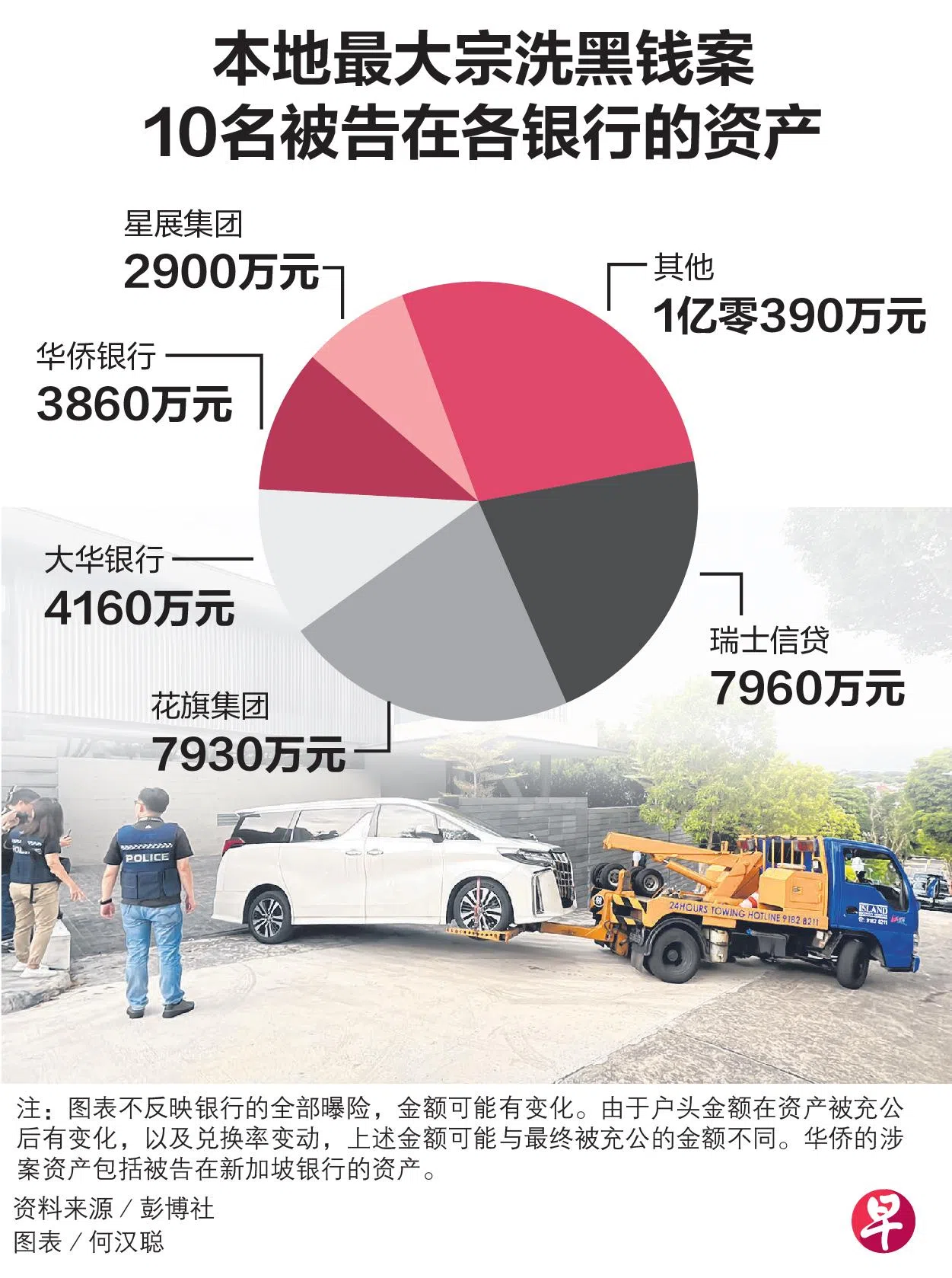 根据彭博社索取的法庭资料,这起洗钱案的10名不法之徒把资产分散到16家金融机构。其中,他们在瑞士信贷(Credit Suisse)和花旗集团(Citigroup)持有最多资产,分别为7960万元和7930万元。 本地三家银行也受牵连,他们在大华银行持有4160万元、在华侨银行持有3860万元,以及在星展集团持有2900万元的资产。华侨的涉案资产包括被告在新加坡银行的资产。