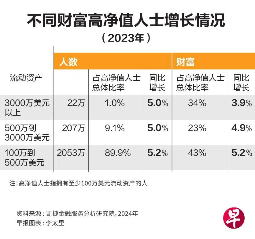 2023年,各财富层次的高净值人口增长基本均衡,都在5%左右。不过,流动资产超过3000万美元超高净值人士,以仅占总高净值人口1%的人数,持有高净值人士总财富的34%。