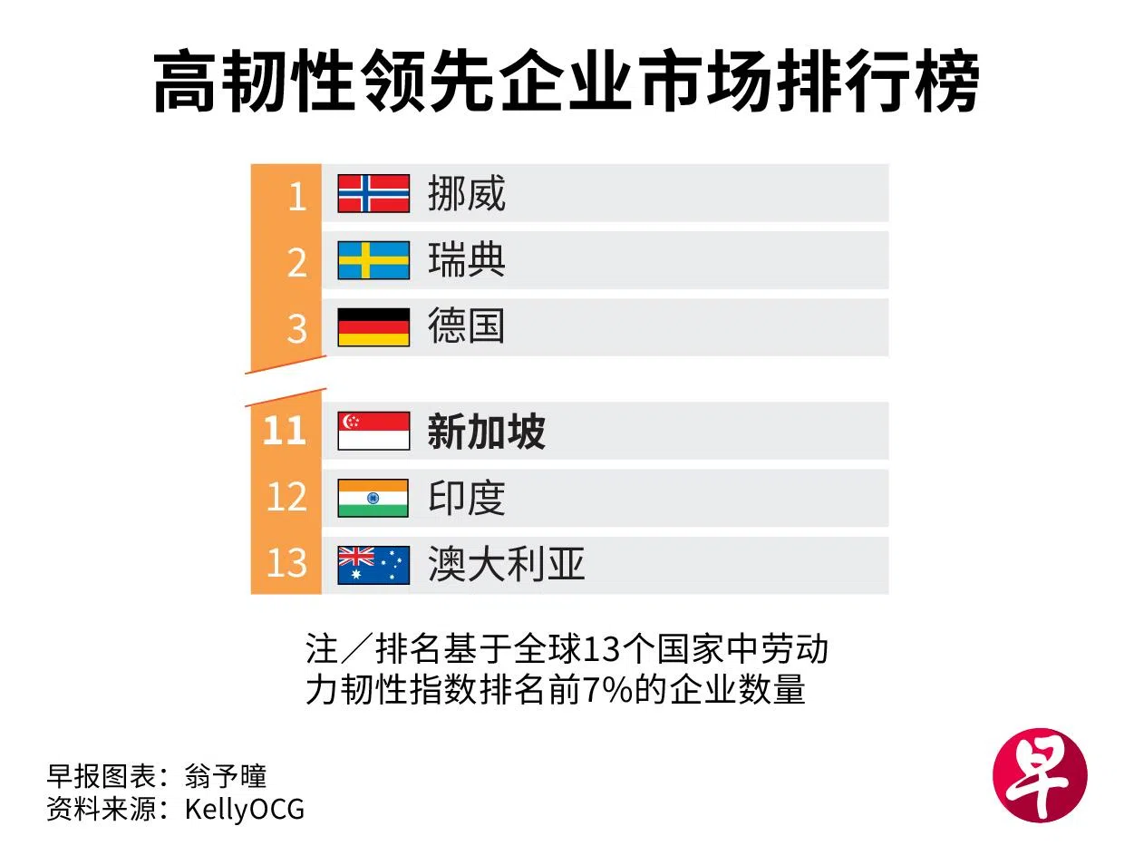 这些高韧性领先企业主要来自挪威、瑞典和德国等,在调查涉及的13个国家中,新加坡的高韧性领先企业数量排名倒数第三。