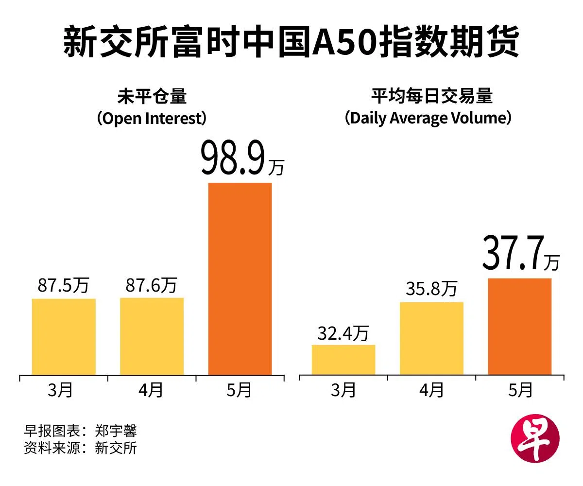 新交所上星期四(6月13日)发布每月市场统计报告,新交所富时中国A50指数期货日均交易量过去三个月稳步上升,5月的日均交易合约环比增5%至37万7000份,达48亿美元(约65亿新元)。5月未平仓合约量(open interest)环比增长13%至98万9000份,达123亿美元(约166亿新元),为2023年1月以来最高水平。
