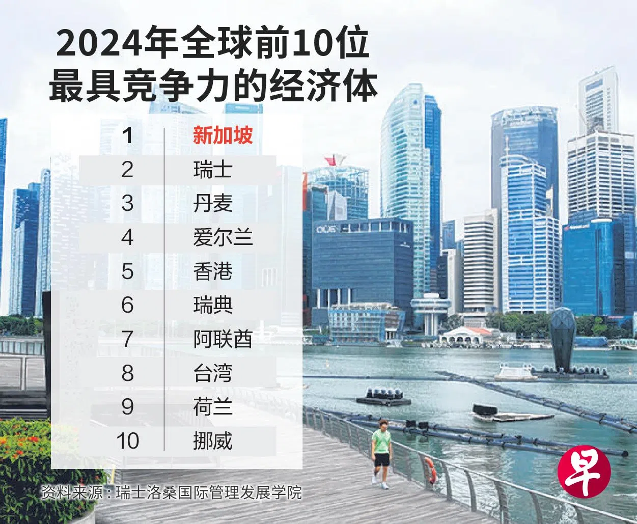 今年榜上三甲依次是新加坡、瑞士和丹麦。排名第四和第五的则分别为爱尔兰和香港。