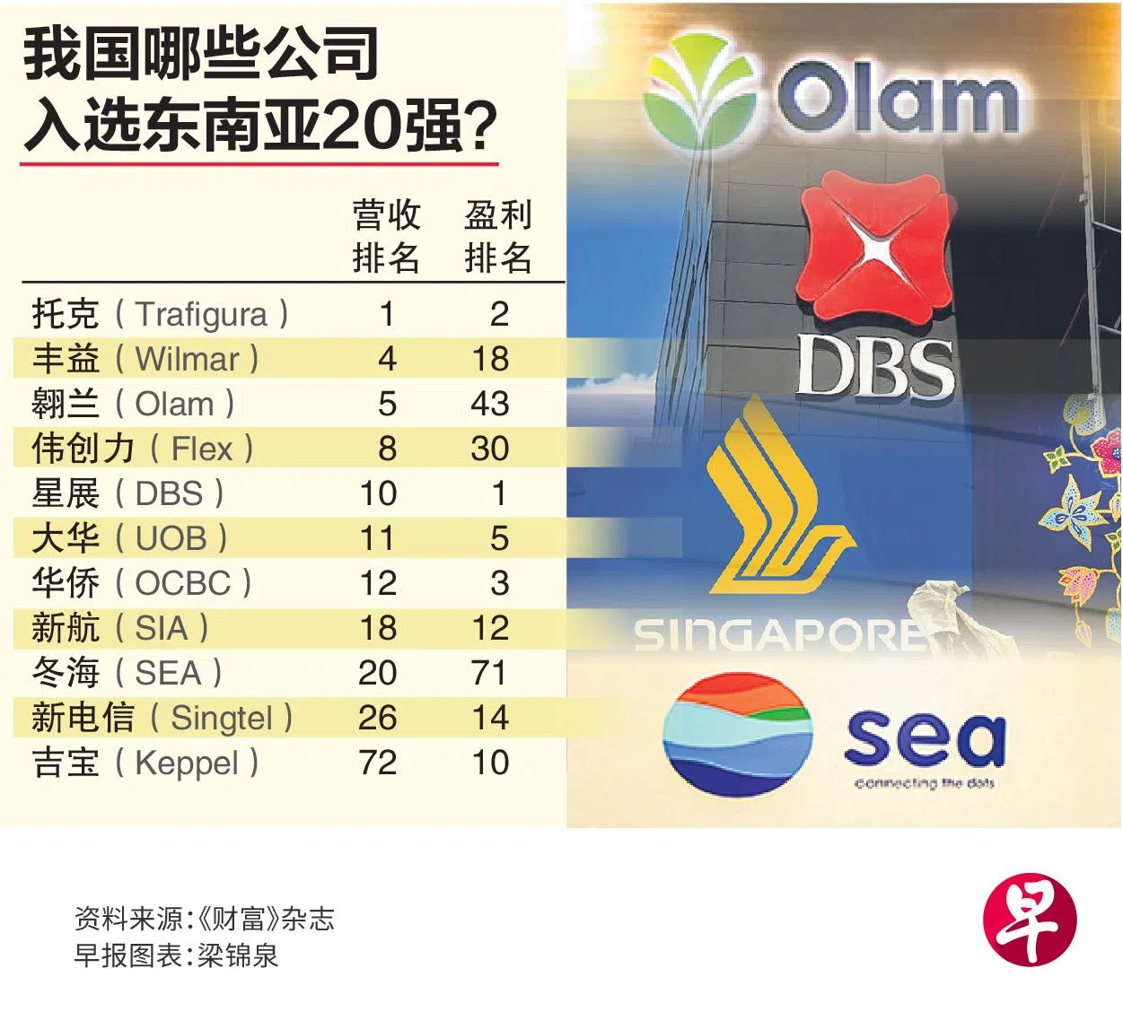 《财富》杂志星期二(6月18日)发布的这个最新排行榜显示,在东南亚国家中,无论按营收还是盈利排名,总部位于新加坡的公司在10强和20强榜单中都占比最大。