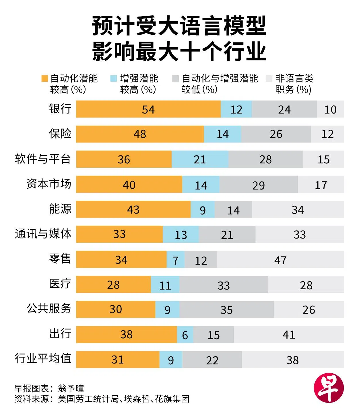 一项新研究显示,在各大行业中,银行业可能被人工智能(AI)取代的岗位比率最高,领域中约54%岗位自动化潜力较高,另12%的岗位则可能因AI而增强。