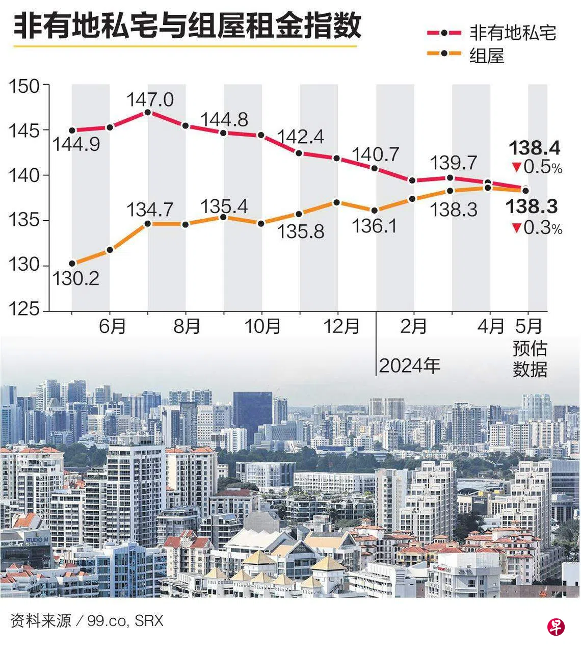 根据房地产网站99.co和新加坡房地产联合交易网SRX星期五(6月21日)发布的预估数据显示,5月份非有地私宅整体的租金比去年同期降低4.5%。