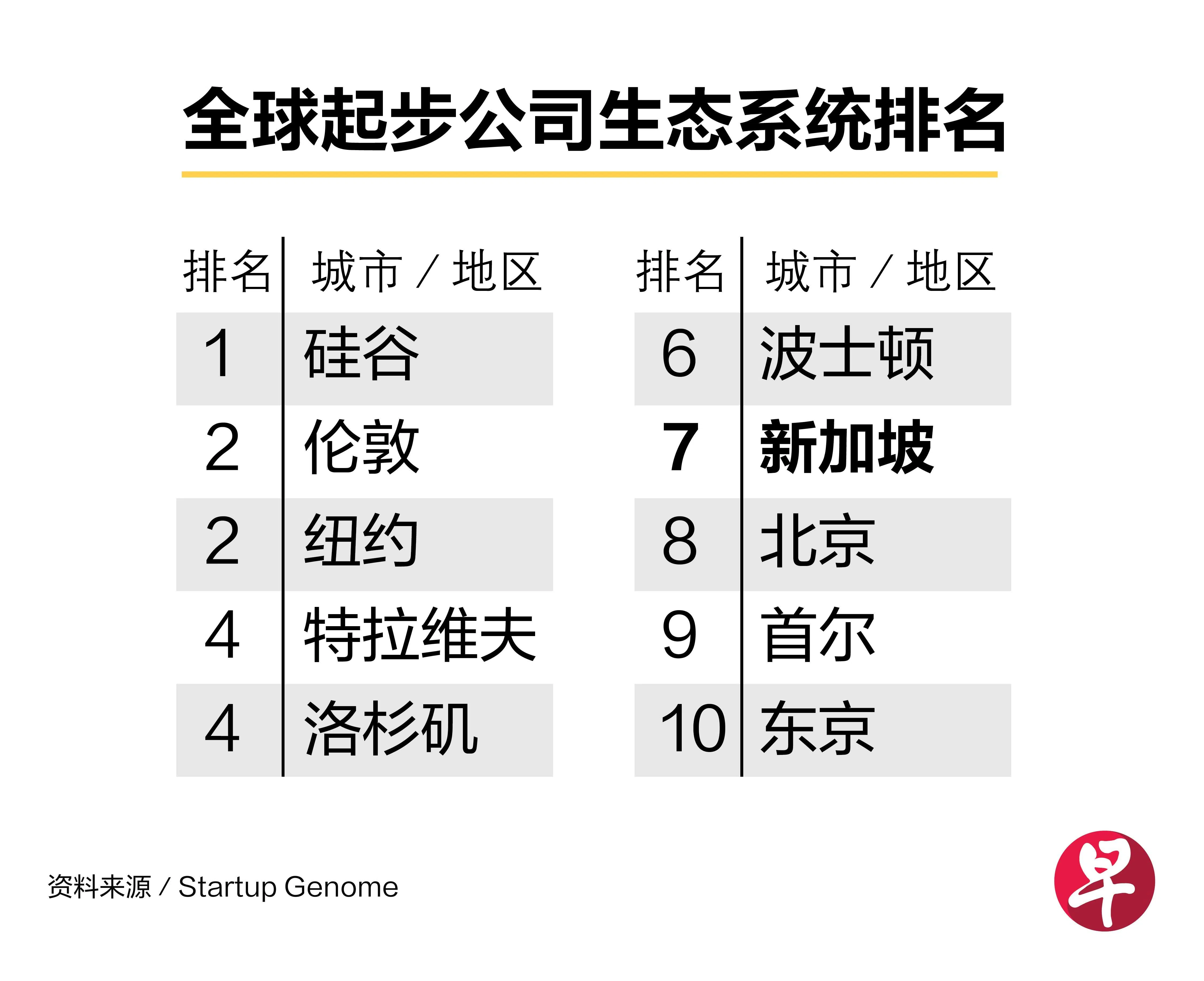 新加坡在今年全球起步公司生态系统排名第七,在亚洲排名第一。