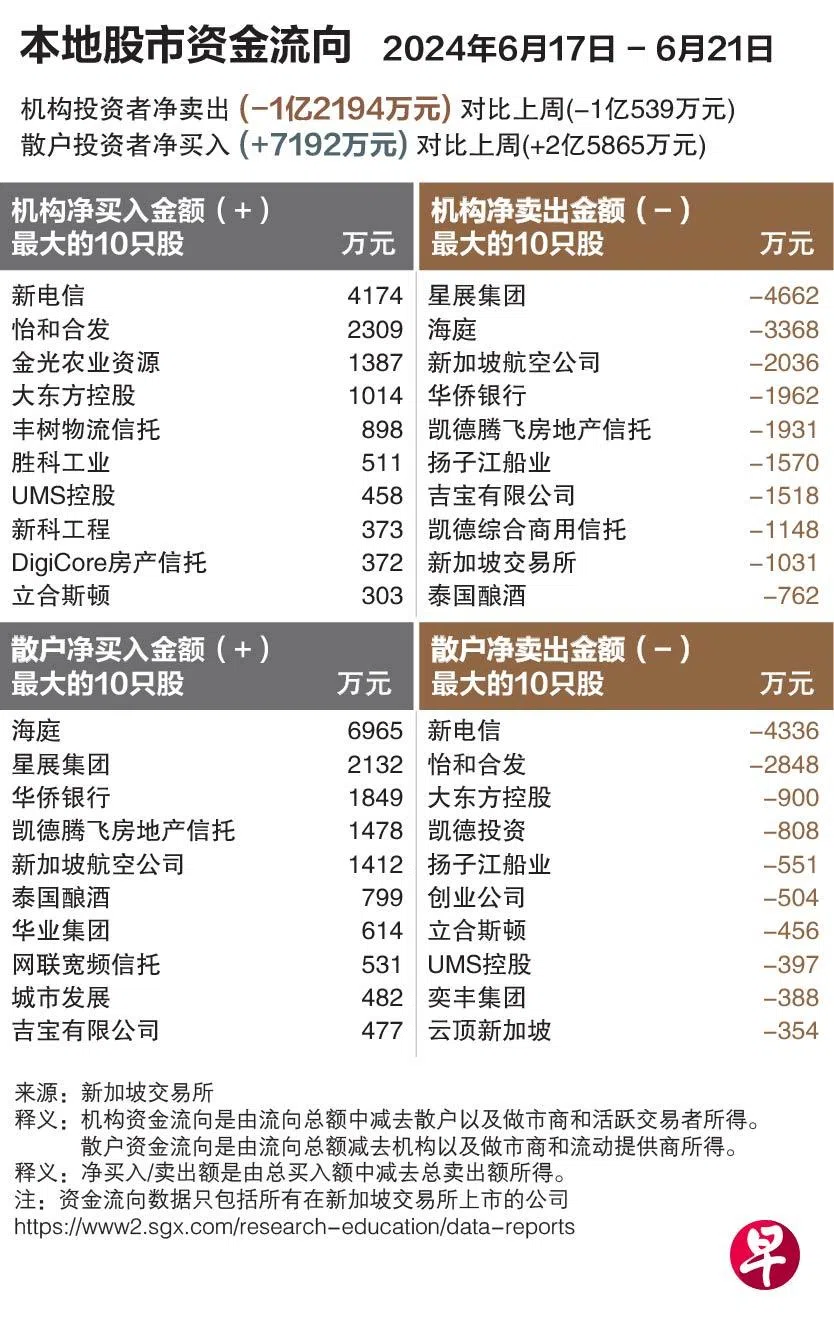 跌幅最大的是海庭(Seatrium)和DFI零售集团 (DFI Retail Group),分别滑落2.63%和2.08%,收报1.48元和1.88美元。