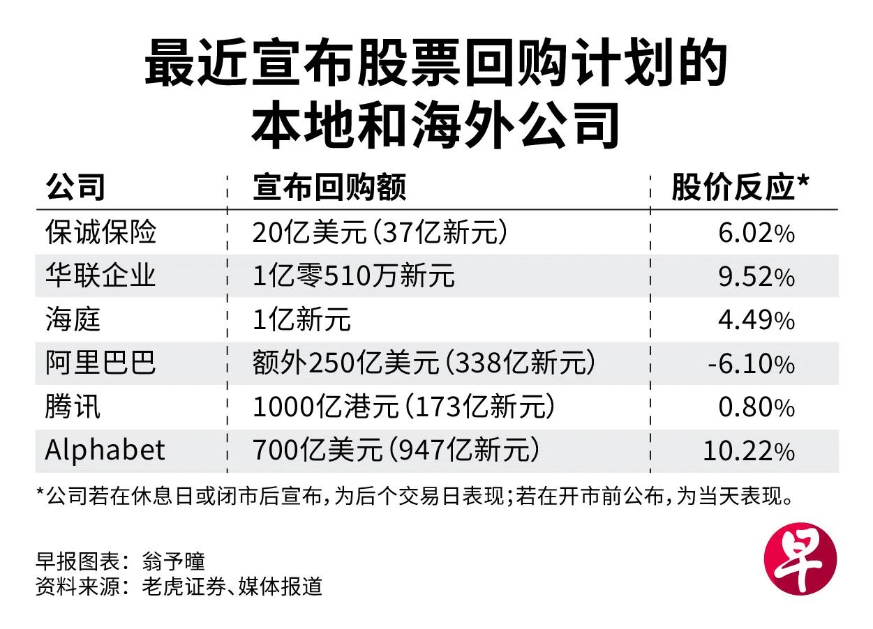 包括保诚保险在内,今年已有数家在新加坡挂牌的公司宣布股票回购计划。此外,美国和香港挂牌的一些公司近期也宣布了回购计划。一般上,公司股价会在计划宣布后走高。