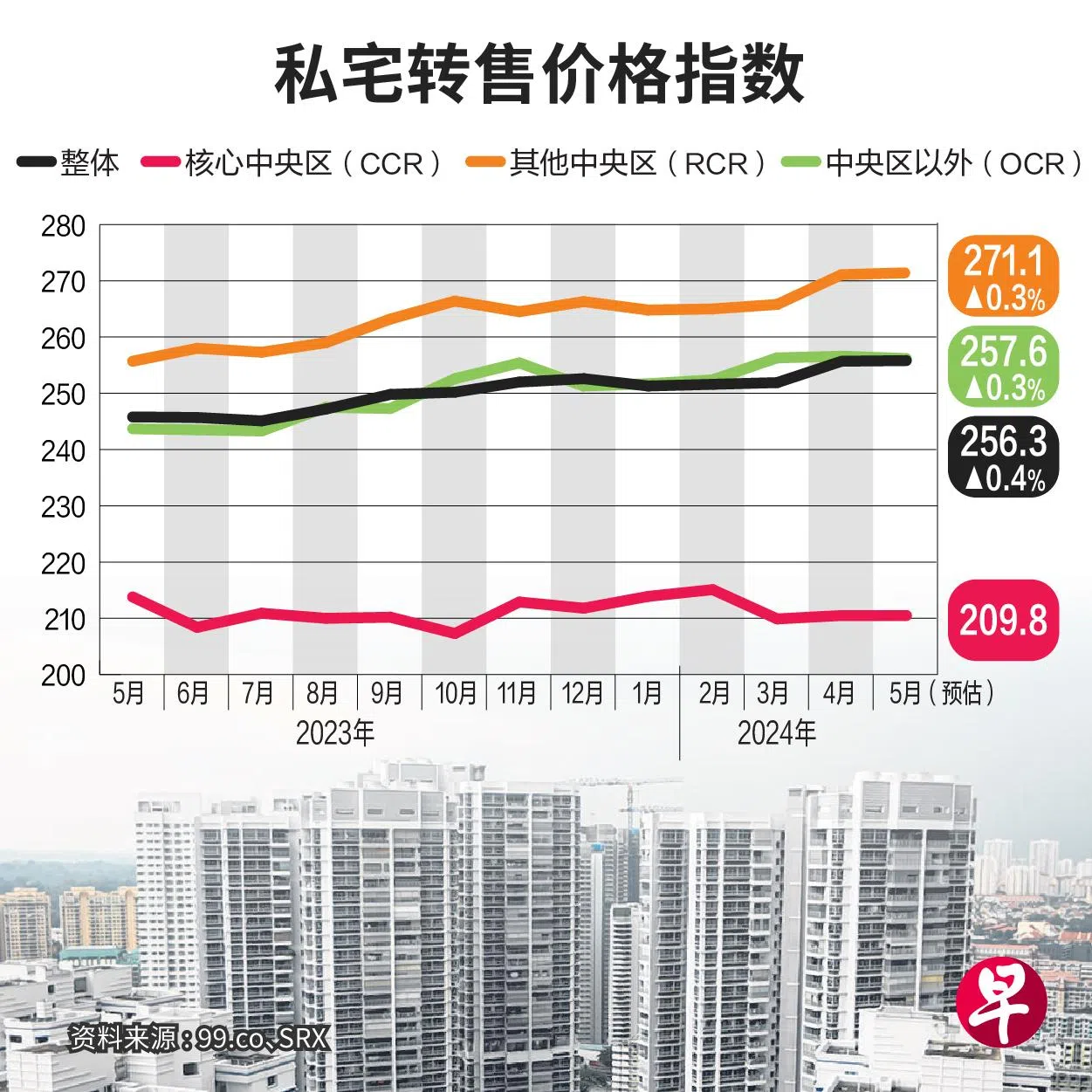 99.co和SRX预估数据显示,在各类别私宅中,代表中档私宅的其他中央区(RCR)和代表大众化私宅的中央区以外(OCR)非有地私宅的转售价均取得0.3%的涨幅,代表高档私宅的核心中央区(CCR)价格则没有变动。