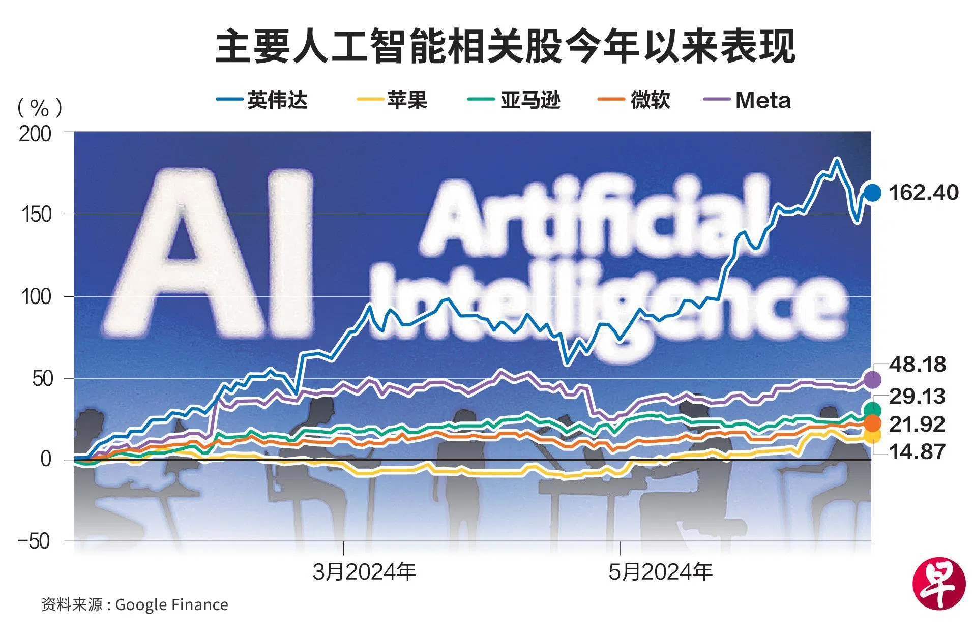 尽管英伟达本周进入回调区间,星期一(24日)收跌6.68%,创两个月最大跌幅,但它的股价今年以来上涨162.4%,贡献了标普500指数今年近三分之一的涨幅。