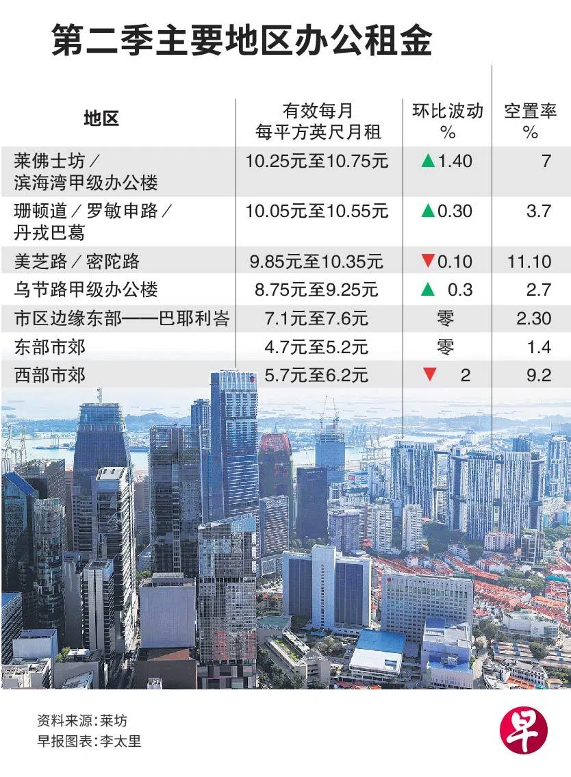 莱坊(Knight Frank)星期一(24日)发布的最新办公楼租金市场报告就显示,莱佛士坊和滨海湾区的优质办公楼租金上半年增长1.3%,比去年同期的2.5%增幅有所放慢。