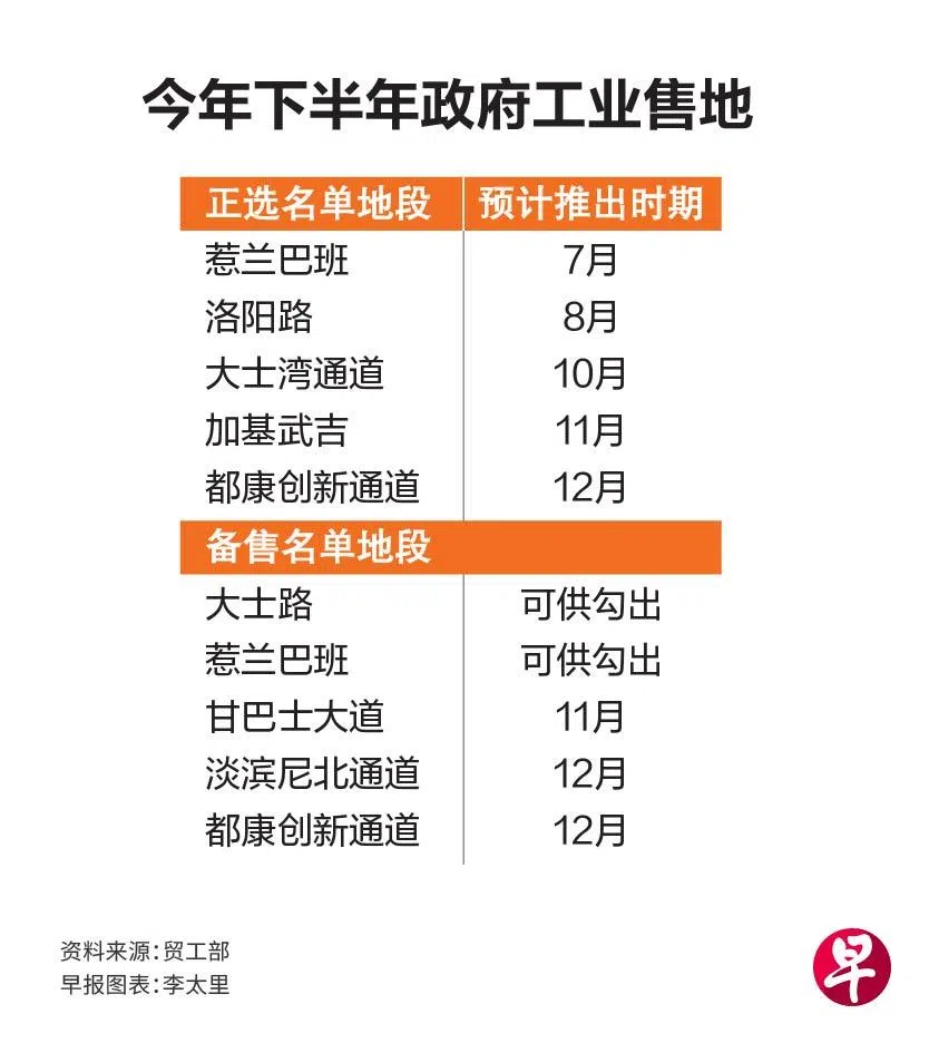 政府工业售地计划今年下半年将推出五幅正选地段,以及五幅备售地段,比今年上半年多出一个,但总面积减少5.45%至约13公顷。
