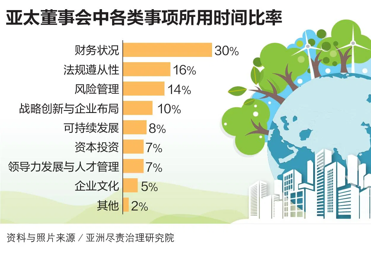 调查显示,目前亚太区域董事会每年花在可持续发展工作的时间仅为8%,而花在企业财务上的时间则为30%,反映董事对ESG的关注度远低于企业财务管理。