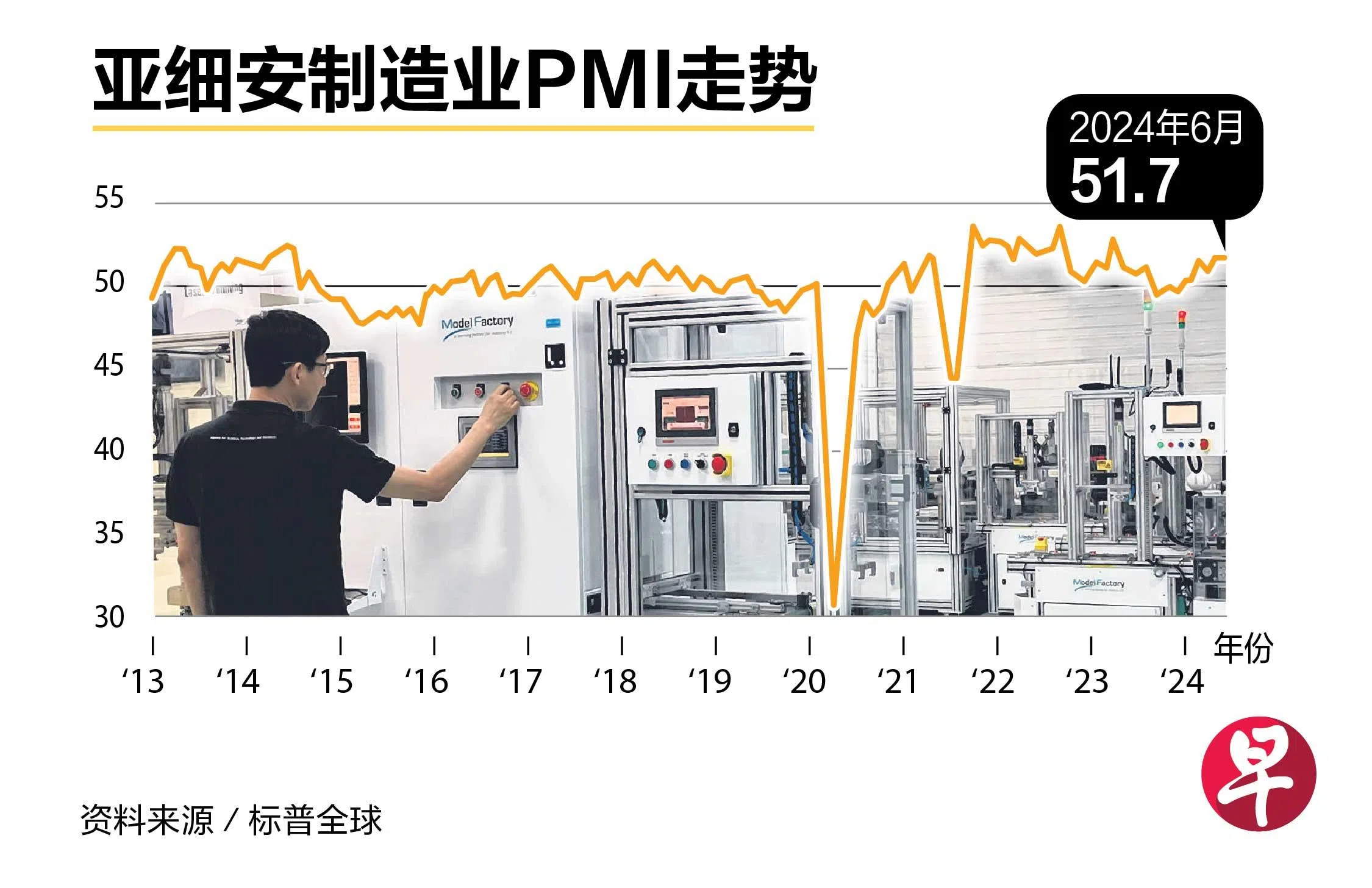 根据标普全球(S&P Global)星期一(7月1日)发布的最新报告,亚细安制造业6月采购经理指数(PMI)与5月持平,维持在51.7。这是区域商业状况连续六个月的温和改善。