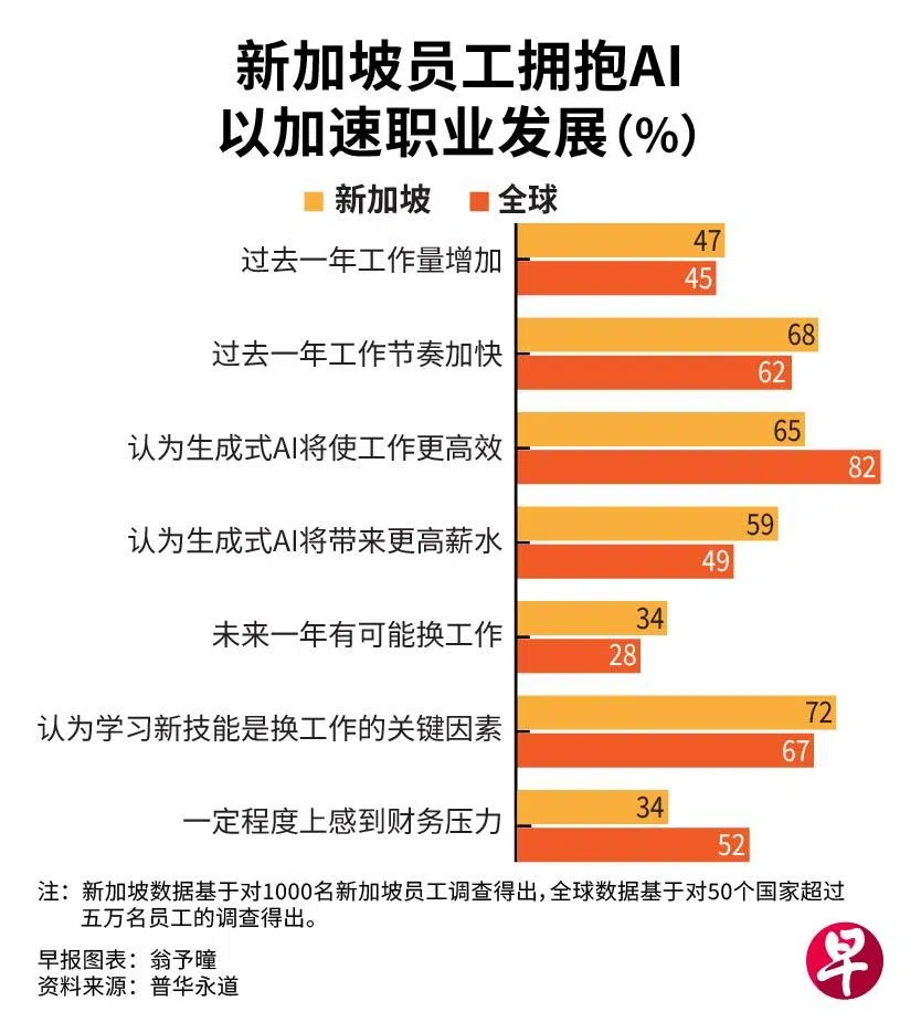 新加坡员工普遍认为,AI将对职业技能的发展产生影响。84%的人预计,AI将为他们创造学习新技能的机会。