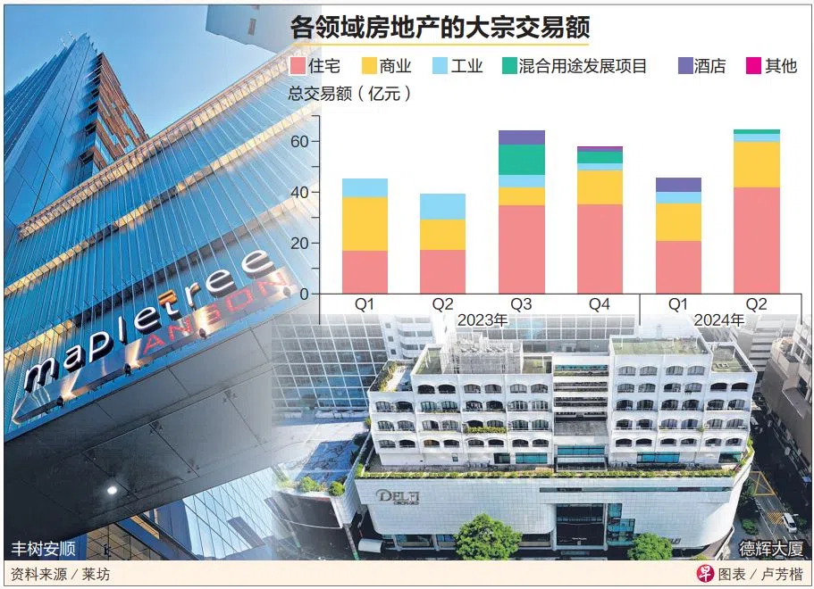 其中,住宅大宗交易总额为42亿元,较上一季的21亿元增加一倍。商业地产大宗交易额环比增长21.1%至18亿元,这主要得益于大型商业建筑,如丰树安顺(Mapletree Anson)和德辉大厦(Delfi Orchard)的出售,这两个地产的交易价格分别为7亿7500万元和4亿3900万元。相比之下,工业领域的增长势头放缓,第二季的大宗交易额环比下降24.8%,同比下降67.2%,至3亿3000万元。