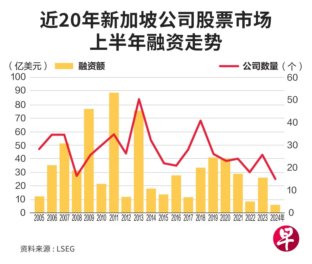 根据市场分析公司LSEG日前发布的新加坡上半年投资银行业务回顾报告,今年上半年,在新加坡注册的上市公司通过后续发行共融资5亿3150万美元,同比下降76.6%。
