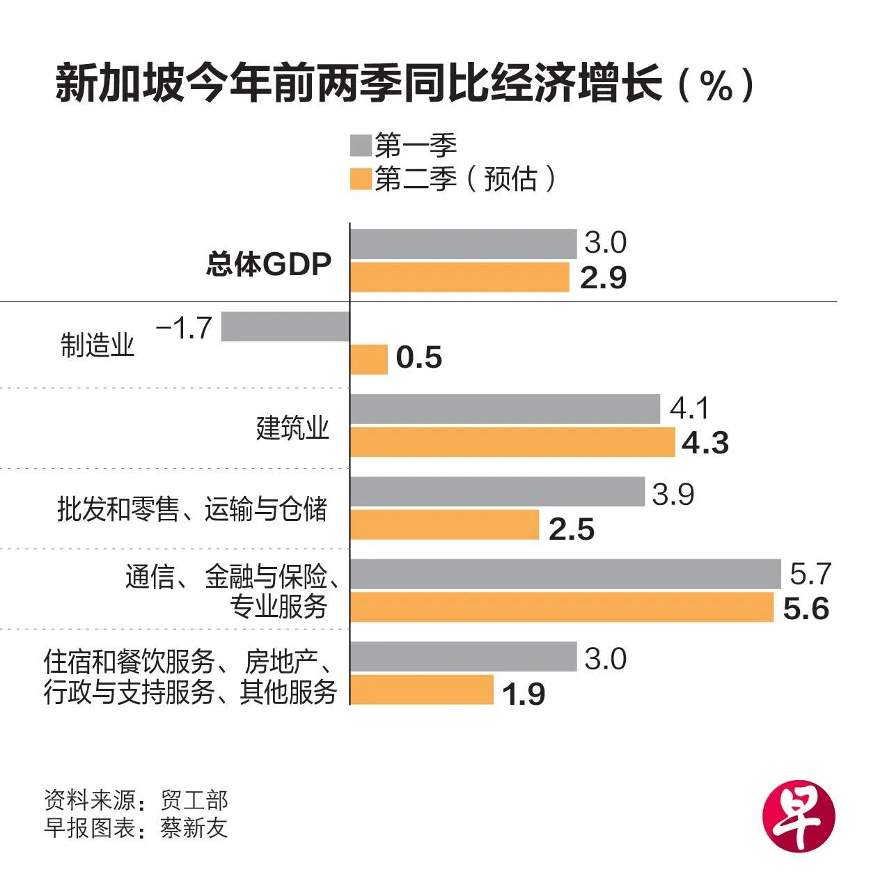 蔡汉廷指出,服务业当中,面向外部行业在第二季表现良好,他预计,贸易相关服务将受到全球贸易逐步恢复和新加坡制造业活动的支持,现代服务业也将在金融活动推动下保持增长。