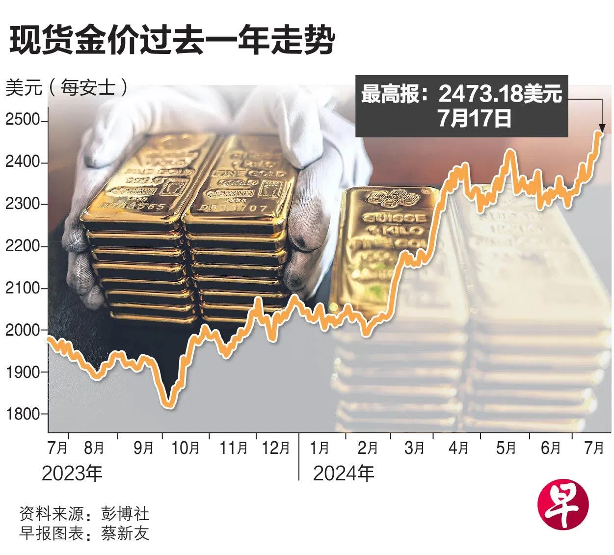 黄金现货价格星期三(7月17日)早上涨至每安士2473.18美元(约3312.76新元),超过了5月份创下的历史最高点。