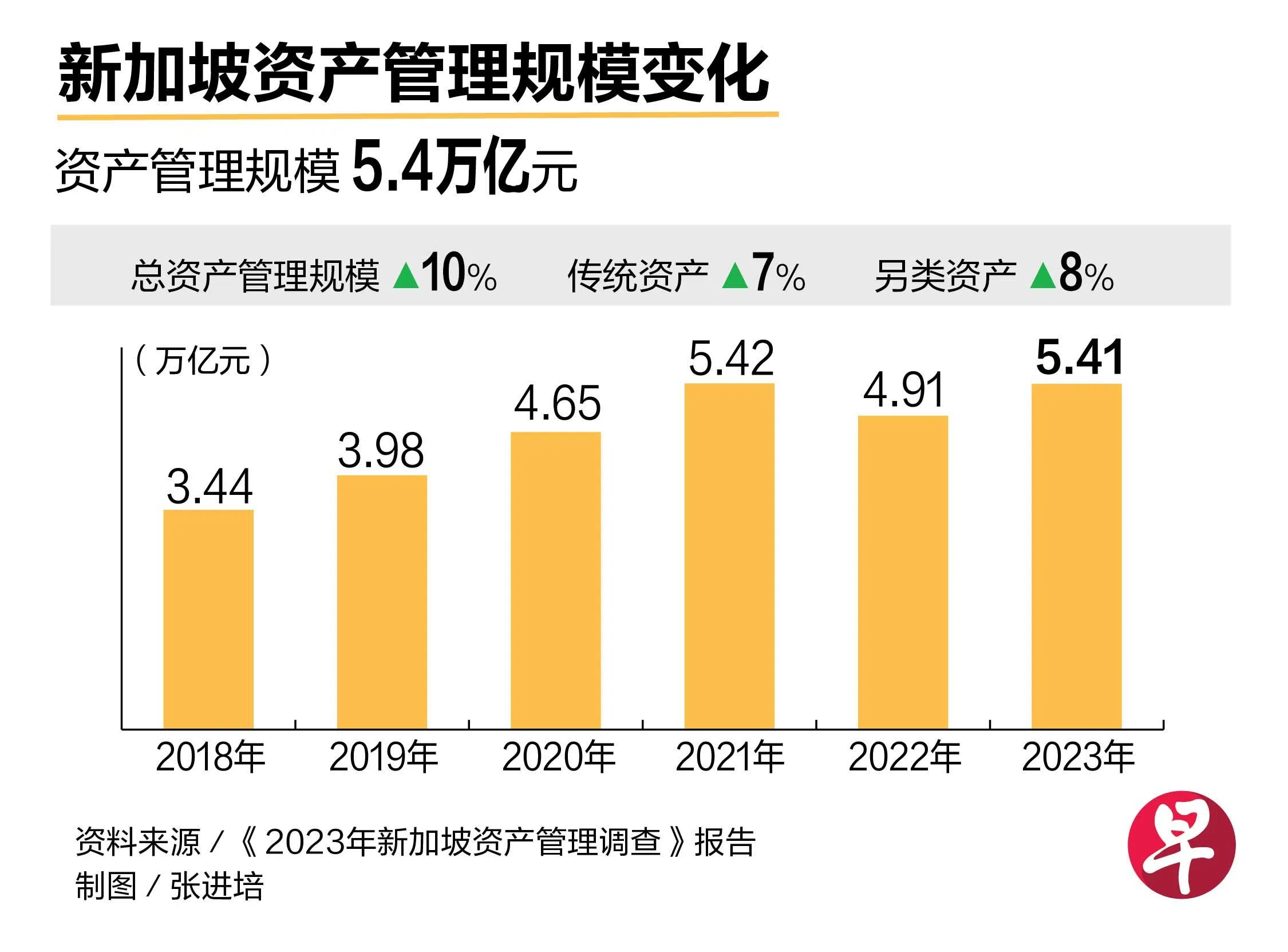 新加坡的资产管理领域持续增长,截至去年底,资产管理规模(AUM)达到5.41万亿元,较前年增长10%,增速高于亚洲整体,也与过去五年复合年均增长率(CAGR)保持一致。此前,我国资产管理规模于2022年减少10%至4.9万亿元。