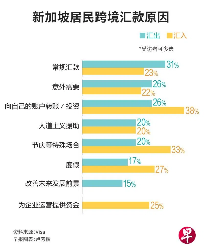 报告显示,新加坡受访者跨境汇款的主要原因包括常规汇款(31%)、意外需要(26%)和向自己的账户转账或投资(26%),而接收汇款的主要原因则包括向自己的账户转账和投资(38%)、节庆等特殊场合(33%)和度假(27%)。