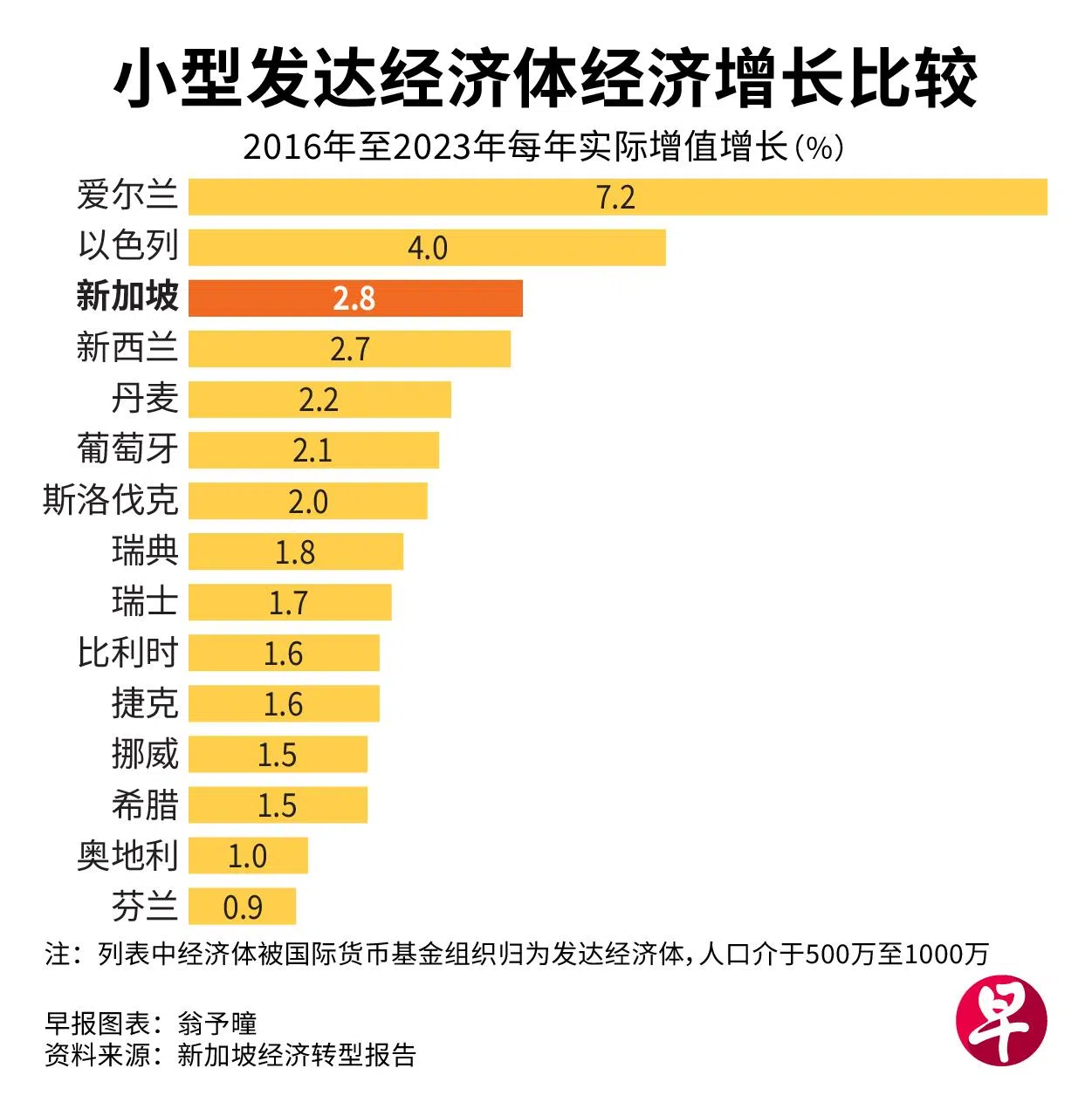 报告发现,与人口接近的小型发达经济体相比,我国在2016年到2023年的实际经济增值增速名列前茅,排在爱尔兰(7.2%)和以色列(4%)之后,超过新西兰(2.7%)、丹麦(2.2%)、瑞典(1.8%)等12个经济体;人力生产力增长也排在第三位。人力生产力是以员工每小时工时的实际增值衡量。