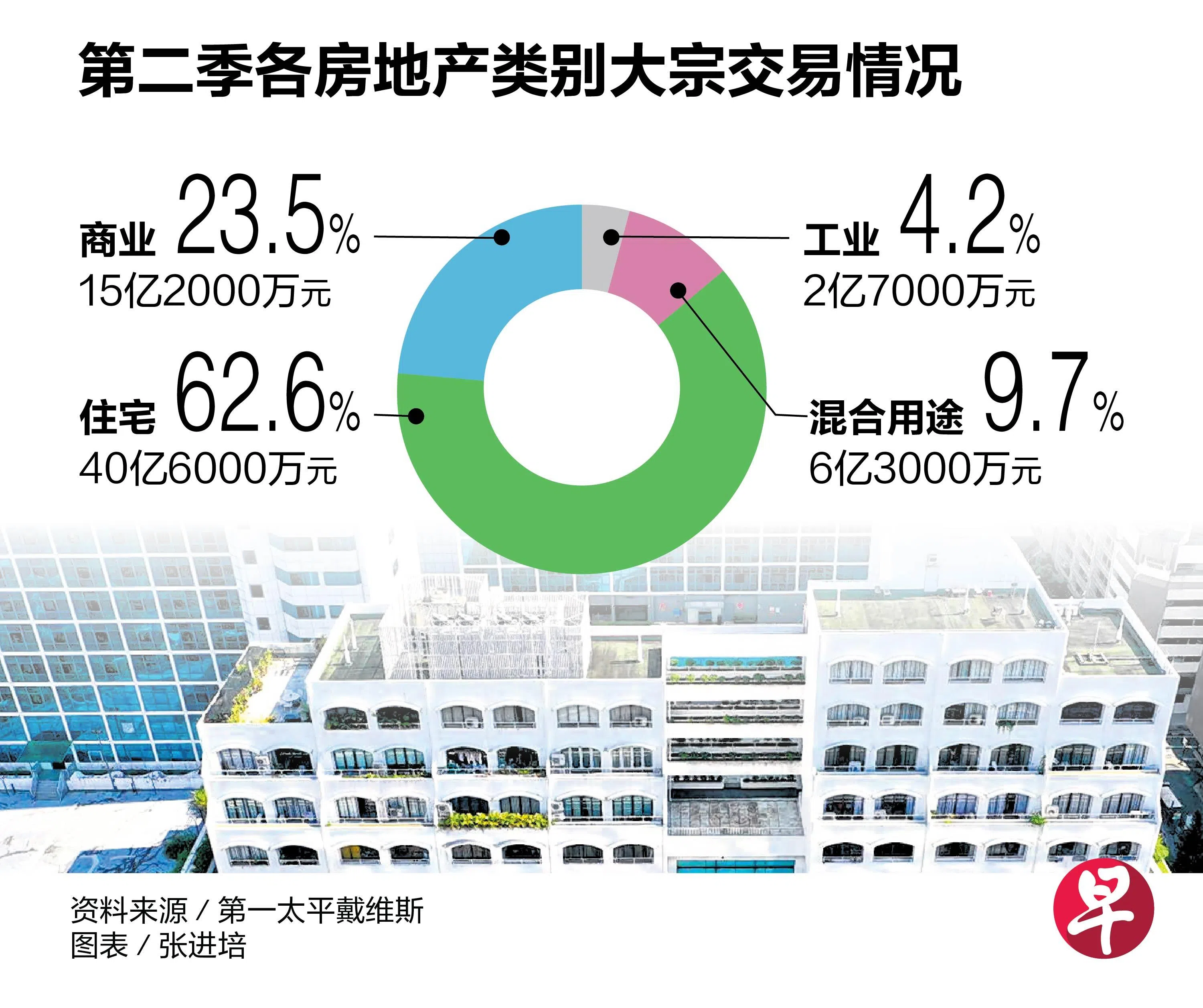 商业大宗房地产交易额在第二季环比增加16.7%,至15亿2000万元,占所有大宗房地产交易额的23.5%;混合用途大宗房地产交易额为6亿2890万元,占总交易额9.7%;工业房地产交易额则环比大跌32.1%至2亿7200万元。