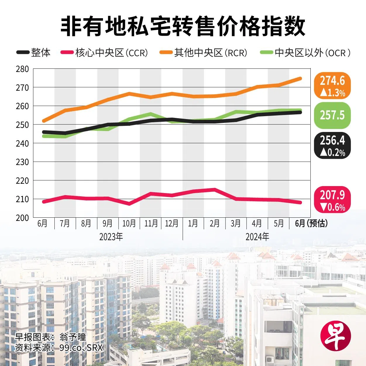 新加坡非有地私宅整体转售价连续四个月上扬,6月环比微涨0.2%。不过受学校假期影响,6月转售量较5月下挫近三成。