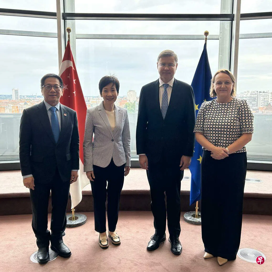 贸工部星期四(7月25日)发布文告说,主管贸易关系的永续发展与环境部长傅海燕与欧盟委员会执行副主席东布罗夫斯基斯(Valdis Dombrovskis),在比利时布鲁塞尔完成欧盟—新加坡数码贸易协定(EU-Singapore Digital Trade Agreement,简称EUSDTA)的谈判。这个数码贸易协定的谈判于去年7月启动。