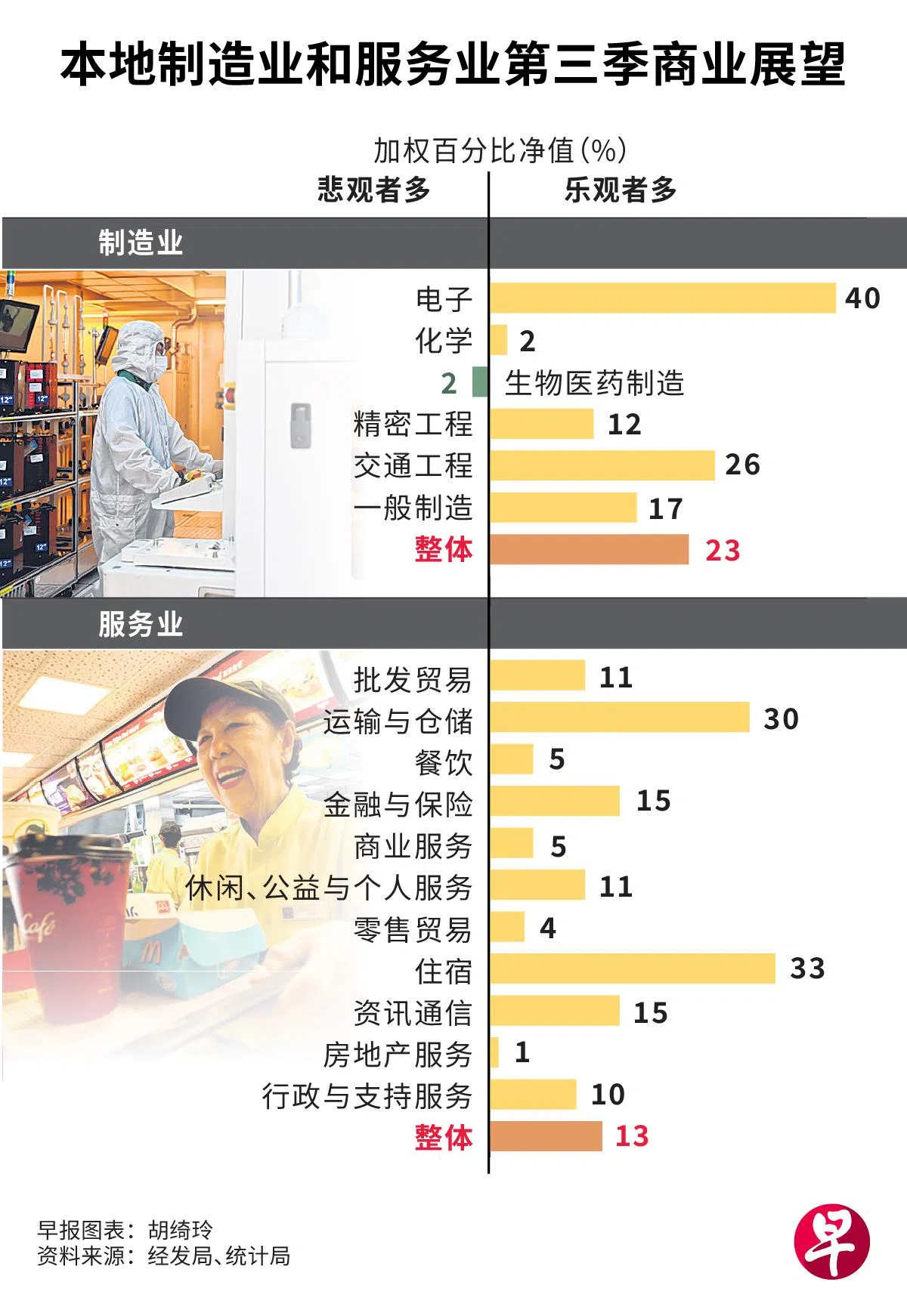 服务业所有领域都认为经营情况会改善。其中,住宿业最为乐观,乐观者比悲观者多出33个百分点,主要是因为9月的F1新加坡大奖赛(Singapore Grand Prix)和下半年更多演唱会及会议、会展与奖励旅游(MICE)活动等,吸引更多旅客前来本地。房地产服务则最为悲观,乐观者仅比悲观者高出一个百分点。