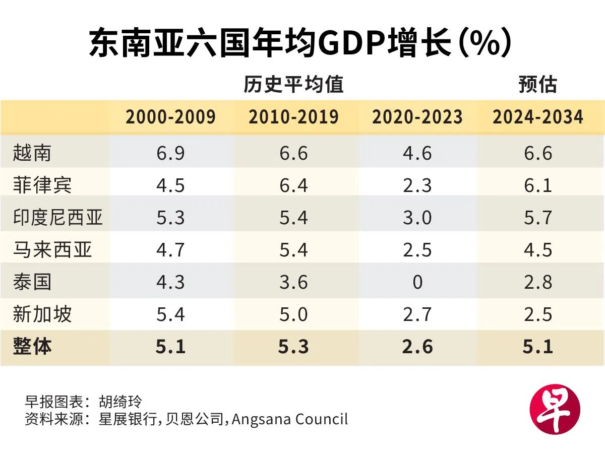 相比之下,虽然东南亚六国的实际国内生产总值在1993年至2023年间只增长2.8倍,但未来10年预计每年增长5.1%,其中新加坡为2.5%,越南则保持领头羊地位,高达6.6%。
