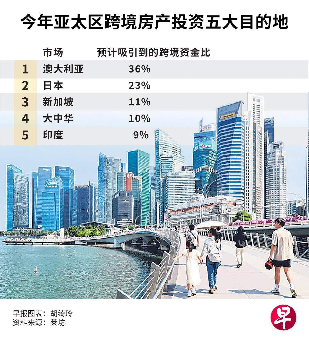 今年新加坡预计吸引亚太地区约11%的跨境资本,排名第三,在澳大利亚和日本之后。澳洲和日本预计分别吸引36%和23%的跨境投资。