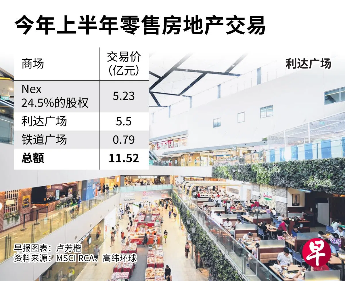 根据高纬环球(Cushman & Wakefield)提供给《联合早报》的数据,在今年首六个月成交的零售房地产交易是Nex的24.5%股权、利达广场(The Seletar Mall)和铁道广场(The Rail Mall)。