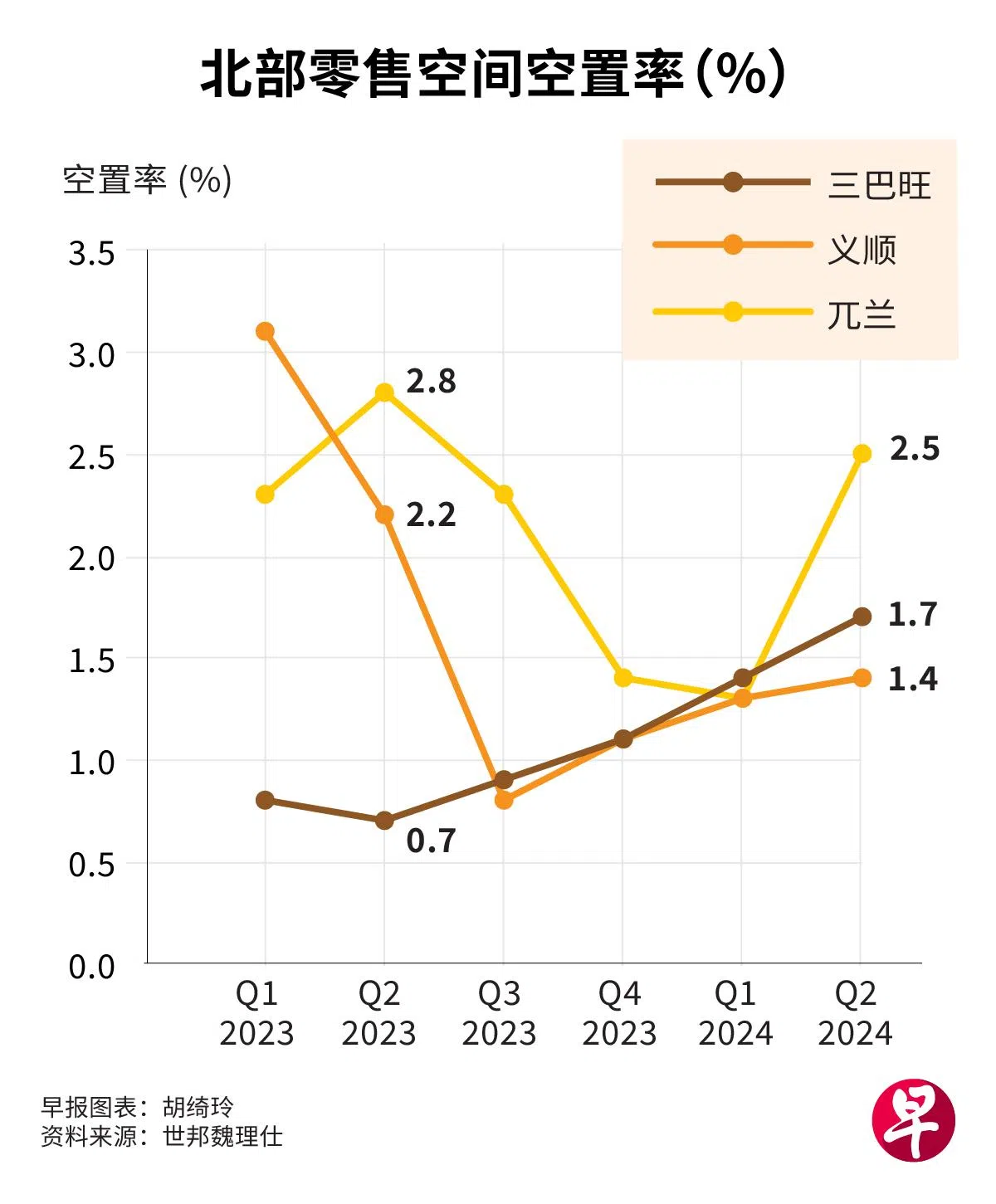 陈美伶指出,尽管过去几个季度这三个地区的空置率有所上升,但兀兰和义顺的空置率仍低于一年前,而三巴旺的零售空间空置率则从2023年第二季的极低水平0.7%回到了正常水平。