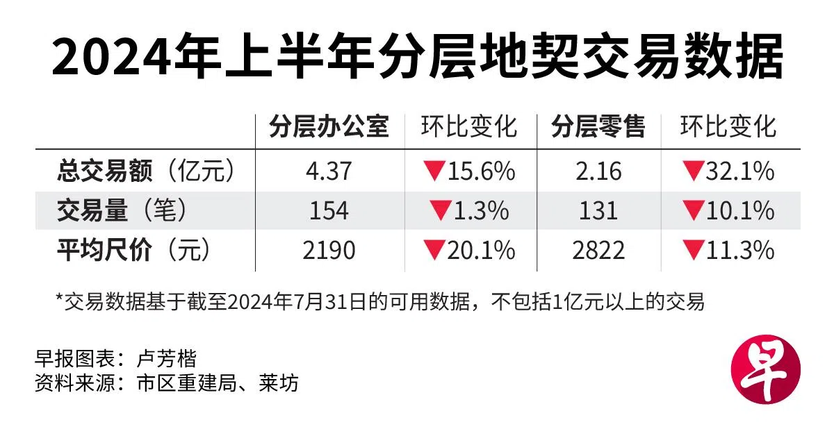 根据报告,上半年共有154个分层办公单位交易,只比2023年下半年少两笔,但平均每平方英尺价格环比大幅下滑20.1%至2190元。
