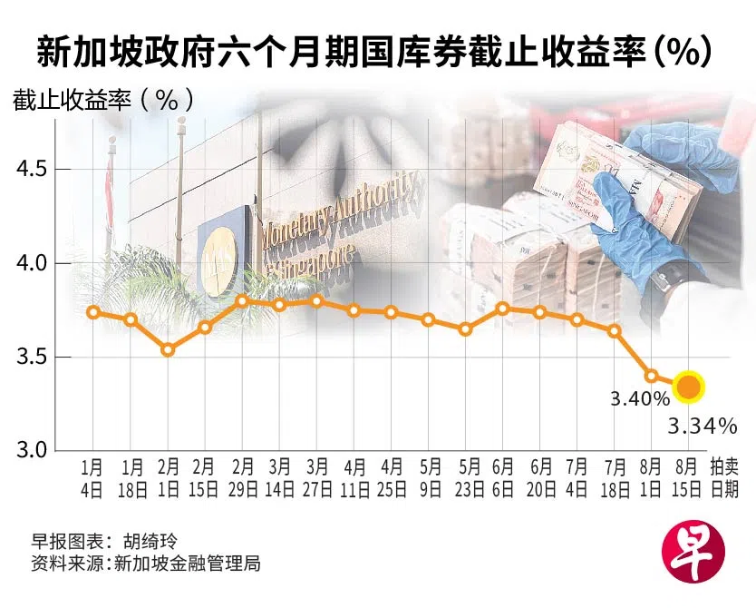 新加坡金融管理局星期四(8月15日)公布最新一批六个月期国库券的截止收益率,为3.34%,比一个月前7月18日拍卖的六个月期国库券截止收益率低了30基点,跌至年内最低,而年初1月4日拍卖的六个月国库券的截止收益率为3.74%。