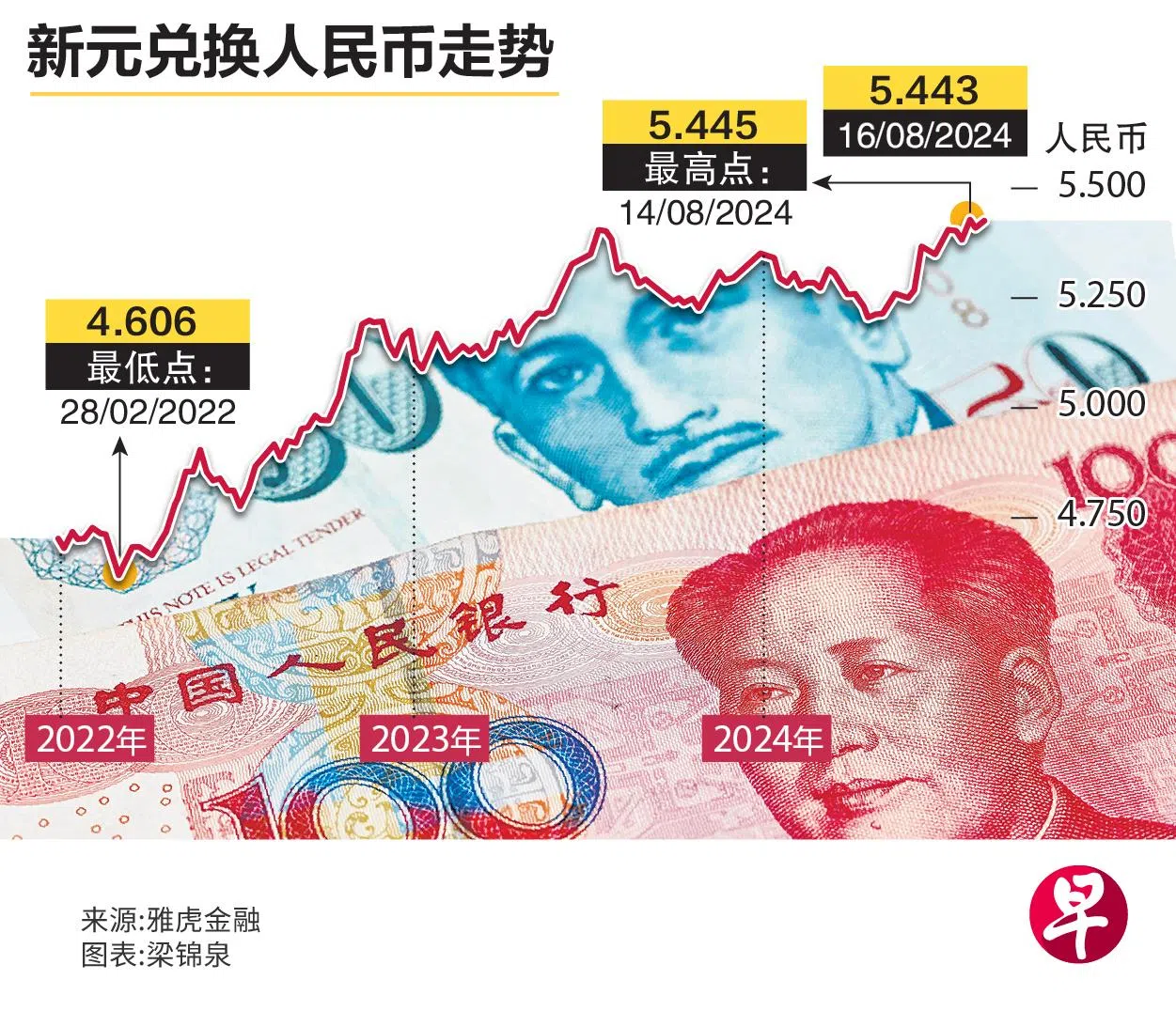 在市场情绪稳定后,虽然美元上涨有限,但新元兑人民币仍在星期三(8月14日)创新高,为1新元兑5.445人民币。下半年来,新元兑人民币已涨超过4%。