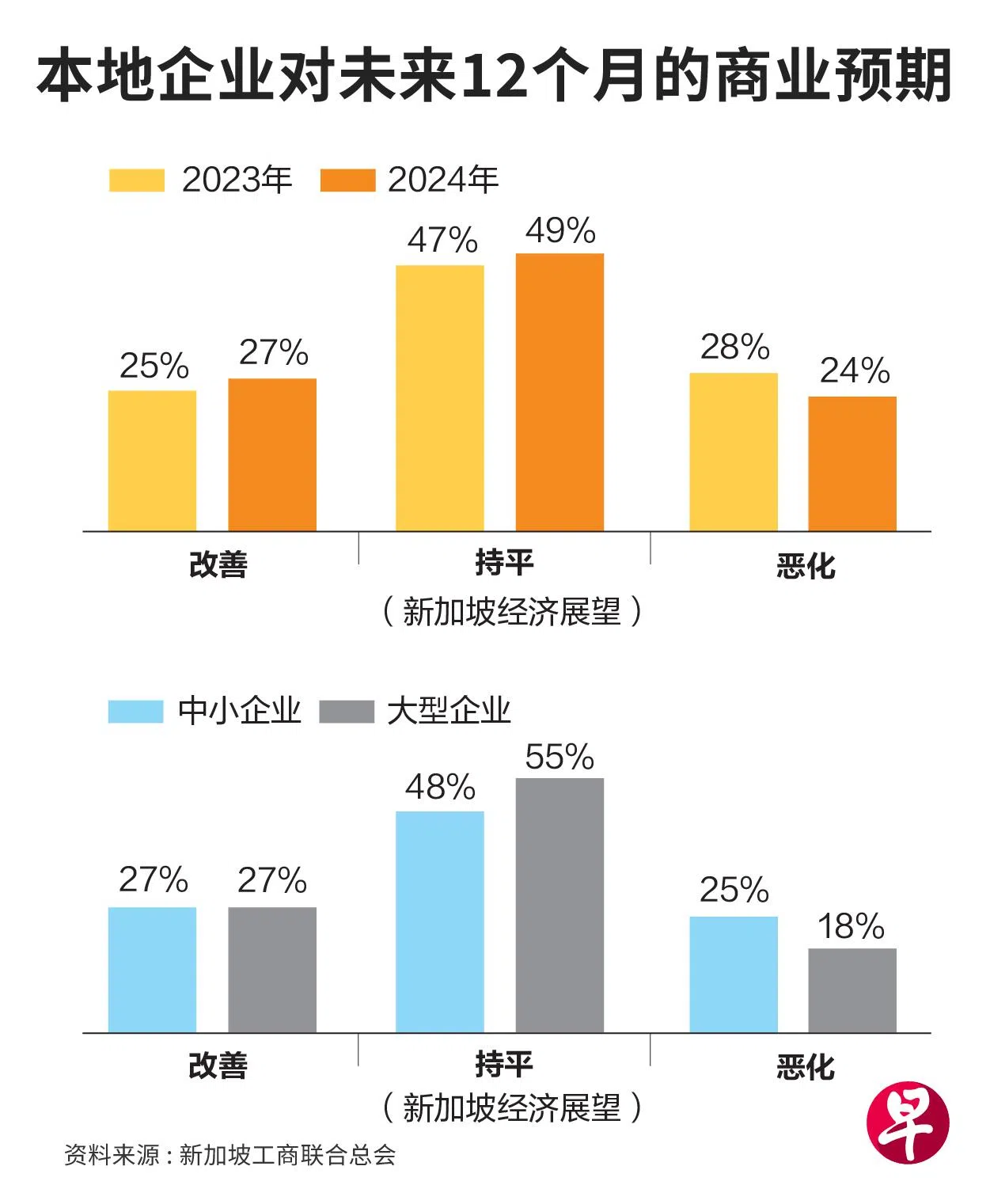 新加坡工商联合总会星期四(8月22日)公布的“2024年全国商业调查之人力与薪酬版”显示,预期经济在接下来12月会改善的商家占27%,比去年高两个百分点;认为经济会恶化的商家则占24%,比去年少了四个百分点。