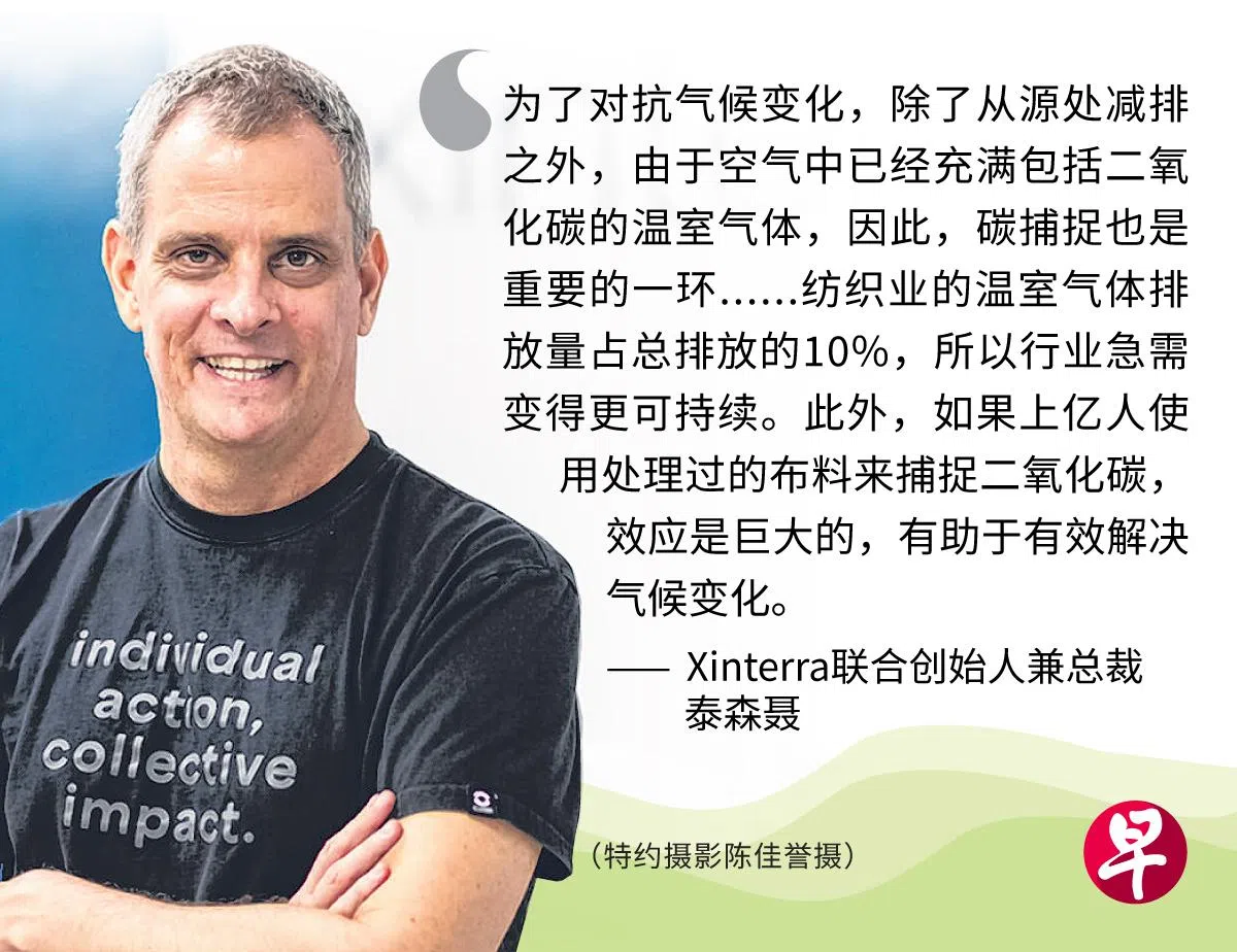 Xinterra联合创始人兼总裁泰森聂(Patrick Teyssonneyre)接受《联合早报》访问时说, 20个人穿着这种涂层制作的T恤一整天,所捕捉的二氧化碳量相当于一棵成熟树木一天的吸收量。