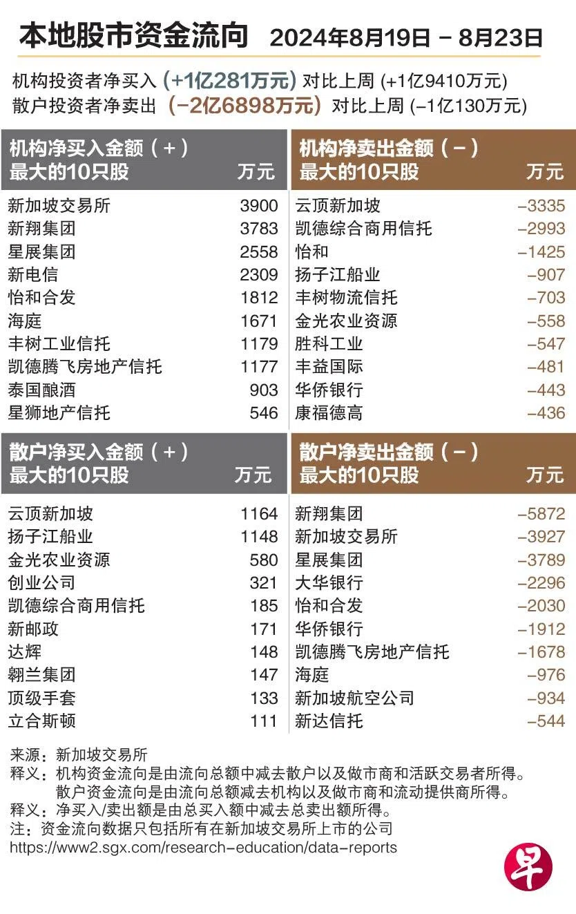 新加坡交易所数据显示,本地股市机构投资者上周净买入1亿281万元的股票。净买入金额最高的股票为新加坡交易所,净卖出金额最高的是云顶新加坡(Genting Singapore)。散户投资者净卖出2亿6898万元的股票,净卖出金额最高达额是新翔集团;净买入金额最高的是云顶新加坡。