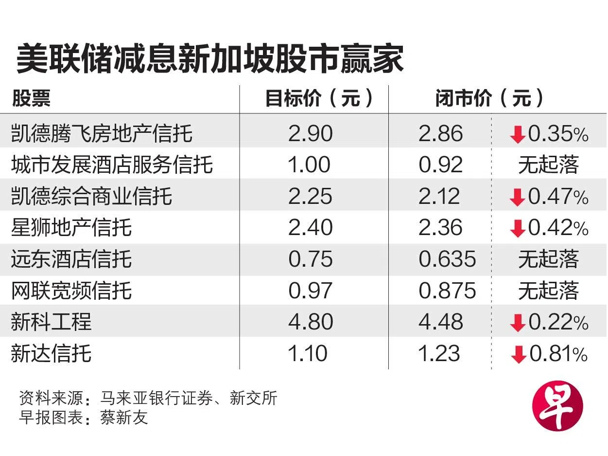 美国联邦储备局主席鲍威尔在杰克逊霍尔研讨会(Jackson Hole Symposium)以“调整货币政策的时机已到”,为市场释放明确的减息信号。分析师估计,新加坡房地产投资信托(S-REIT)最受惠,部分工业股和电信股预料也是减息周期的赢家。