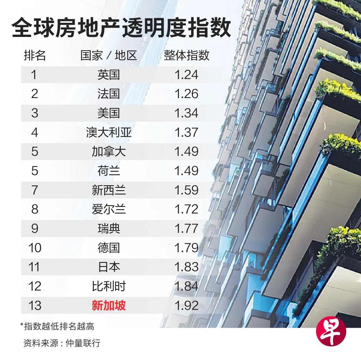 新加坡对可持续发展的重视,使它在今年全球房地产透明度指数中排名第13,相比上次的排名,上升一个位子。