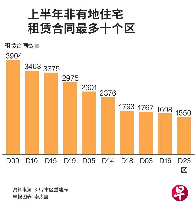 房地产经纪公司SRI星期一(9月2日)发布的一份报告显示,今年上半年第9区的非有地住宅租赁合同达到3904份,为全国最多。第10区和15区紧随其后,分别有3463和3375份租赁合同。