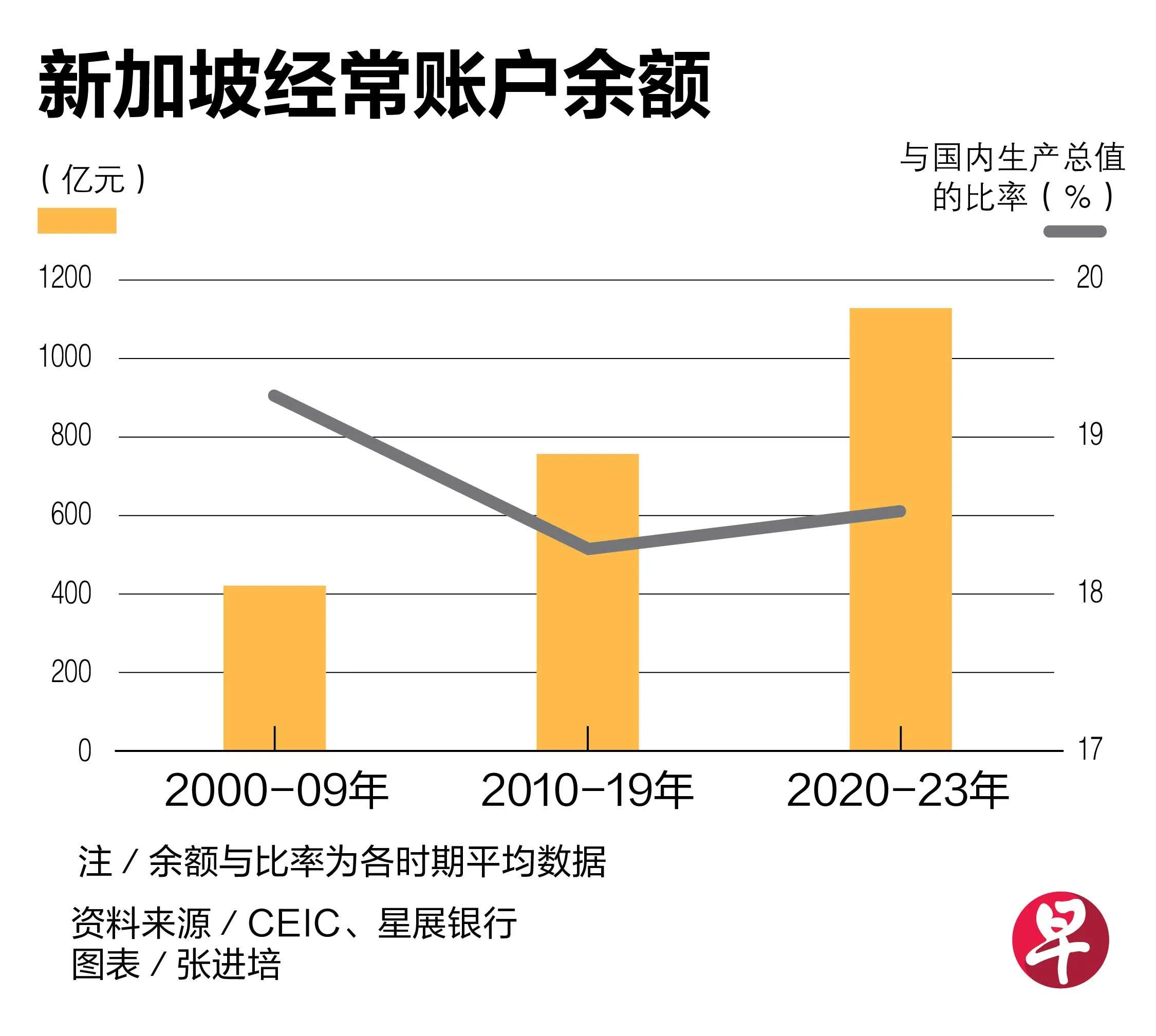 蔡汉廷指出,新加坡经常账户余额的规模在全球一直名列前十。新加坡的平均经常账户余额,从2000年至2009年的420亿元增加约两倍,2020年至2023年达到1130亿元,位列第八。