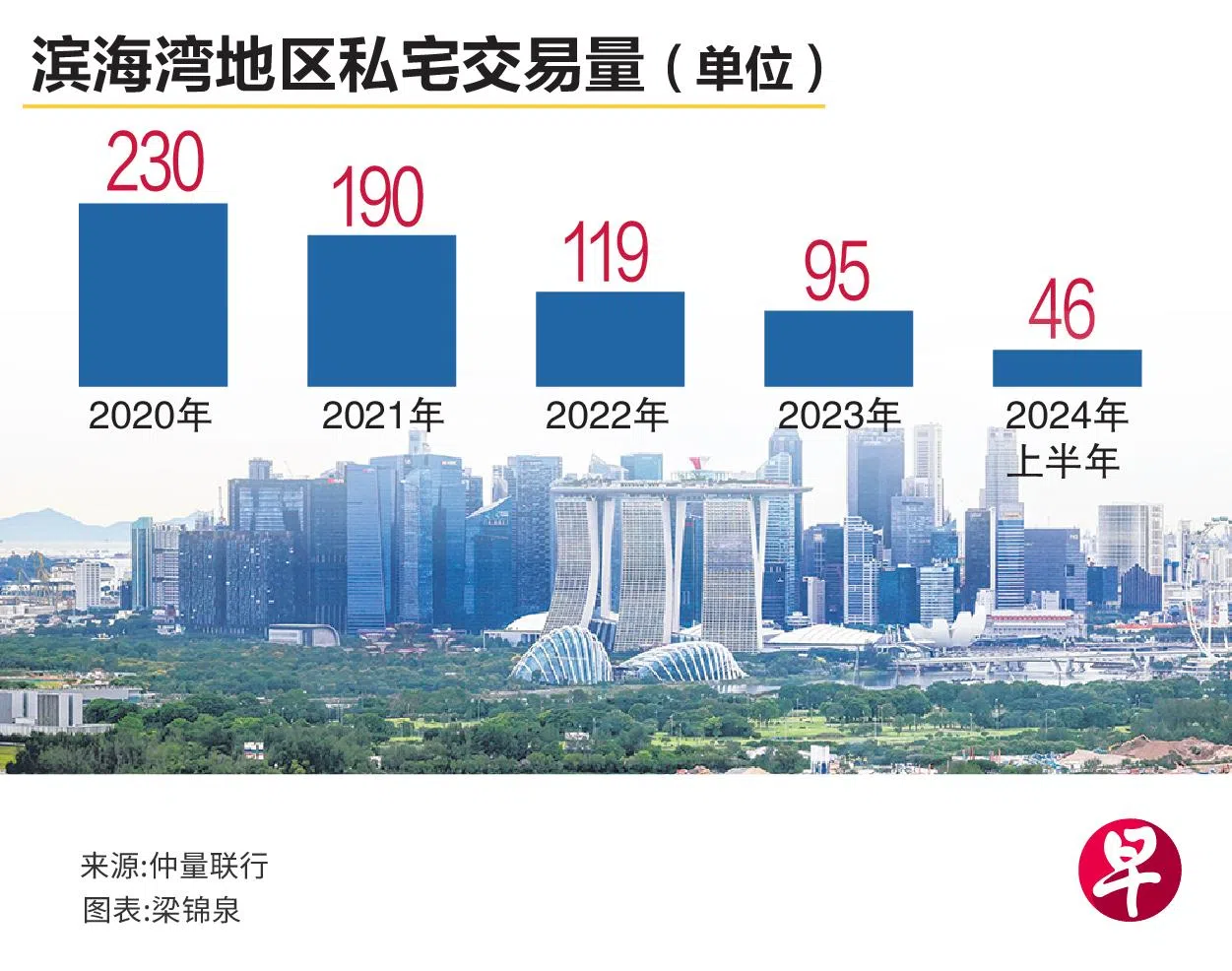 根据仲量联行(JLL)提供给《联合早报》的数据,截至今年第二季,位于核心中央区(CCR)的滨海湾区,已完工的非有地私宅单位共2802个,而区内的私宅交易量则从2020年高峰的230个单位,逐步减少至今年上半年的46个。