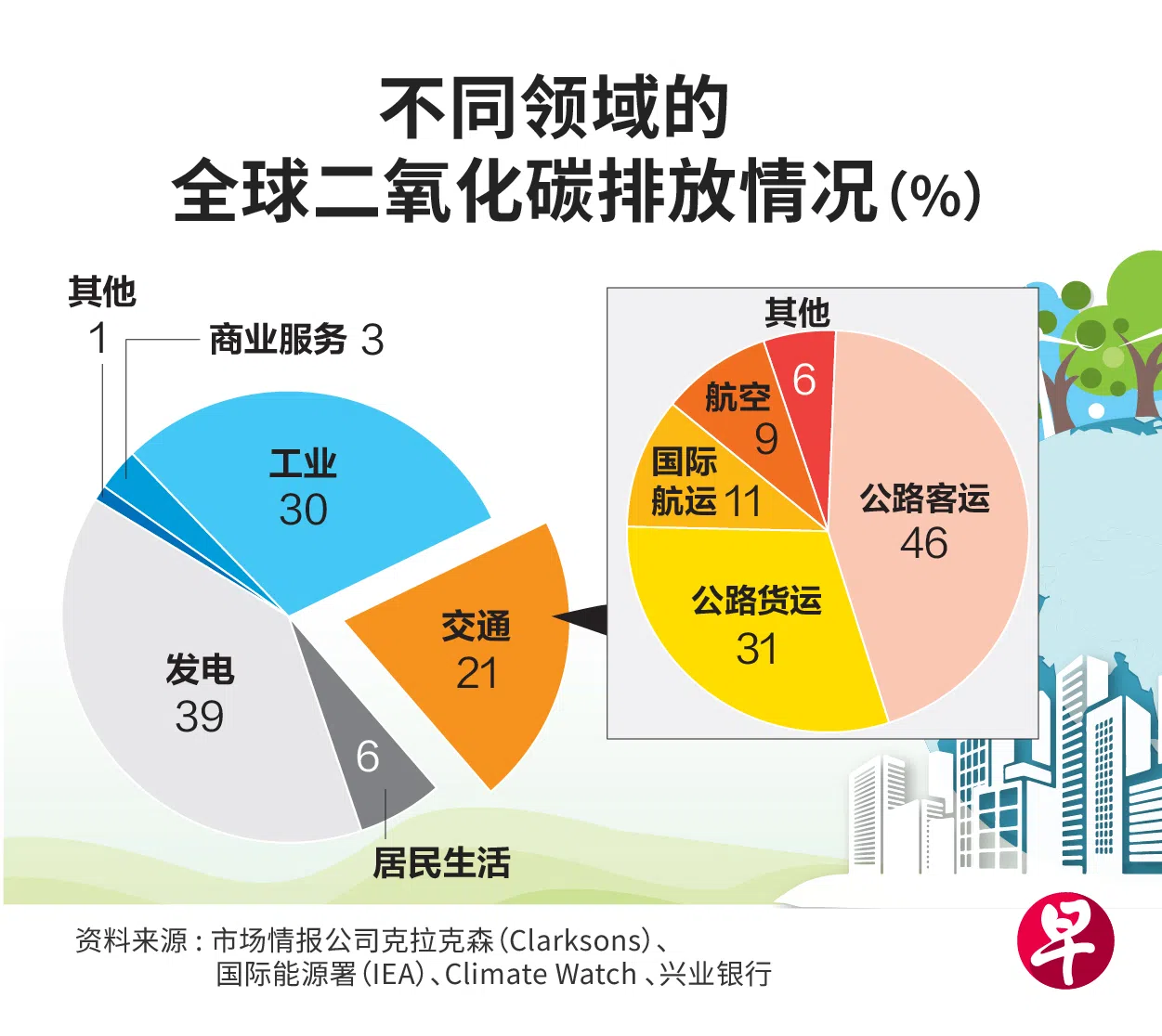 兴业银行(RHB)在一份名为《净零运输》的报告中指出,在交通运输领域,公路客运的温室气体排放量占总排放量的46%。目前,向电动汽车的转型旨在减少甚至消除汽车和卡车的碳排放。